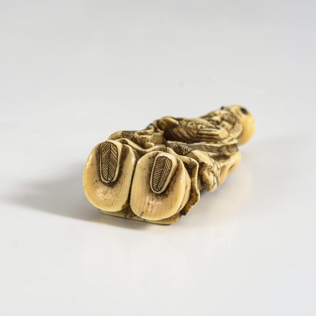 Elfenbein - Netsuke Mann mit Tintenfisch auf dem Kopf.