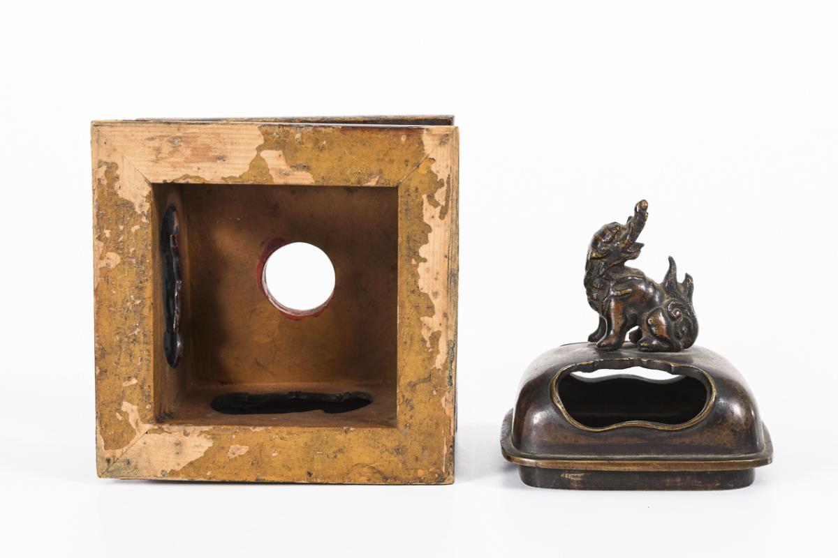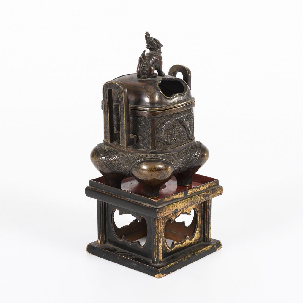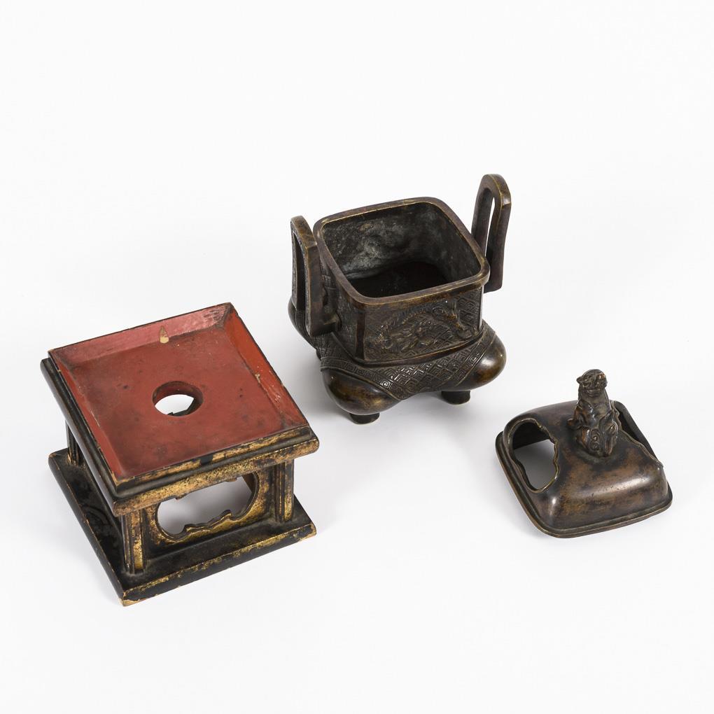 Vierbeiniges Deckelgefäß mit zwei Handhaben und Drachenrelief. Optisch ist das Gefäß gestaltet, als ob ein rechteckiger Korpus auf einem niedrigen Hocker mit Decke stehen würde. Deckel mit größeren Öffnungen und Fo-Hund als Knauf. Dazugehöriger Holzsockel, schwarz lackiert.