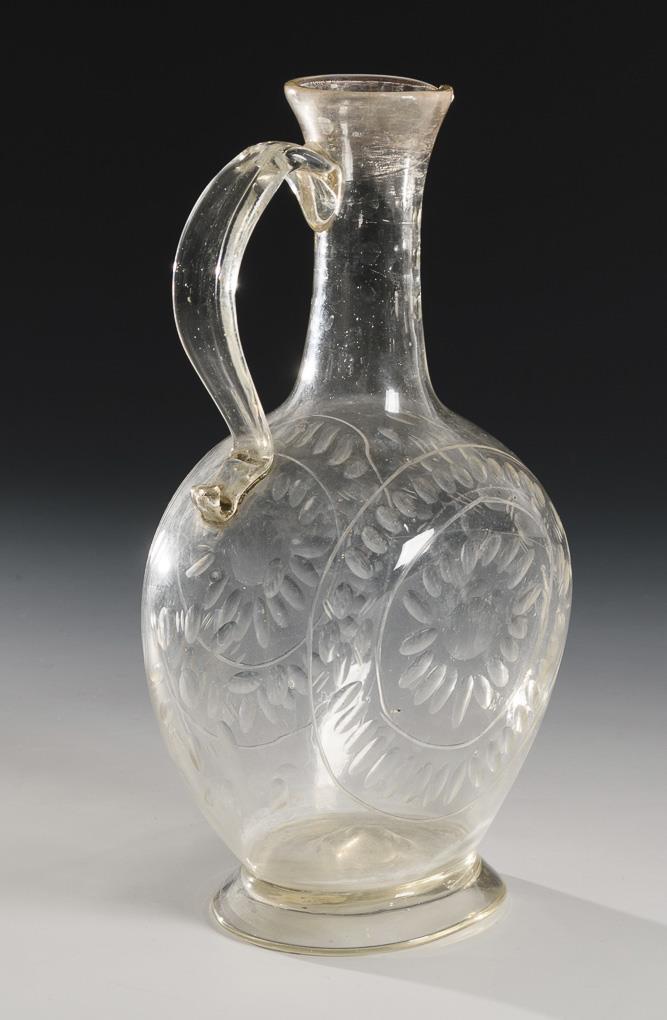 Kugeliger, leicht geplatteter Korpus mit Enghals und Bandhenkel. Blütenförmiges Olivenschliffdekor. Etwas wackeliger Stand.