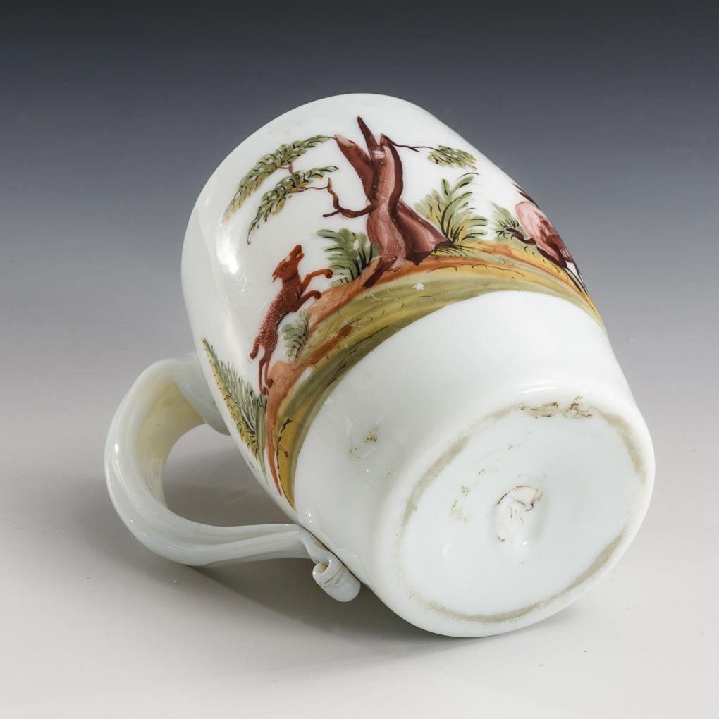 Leicht gebauchter Krug mit der umlaufenden Darstellung einer Waldlandschaft mit Jäger, Jagdhund und Wildschwein. Spannungsriss am unteren Henkelansatz.