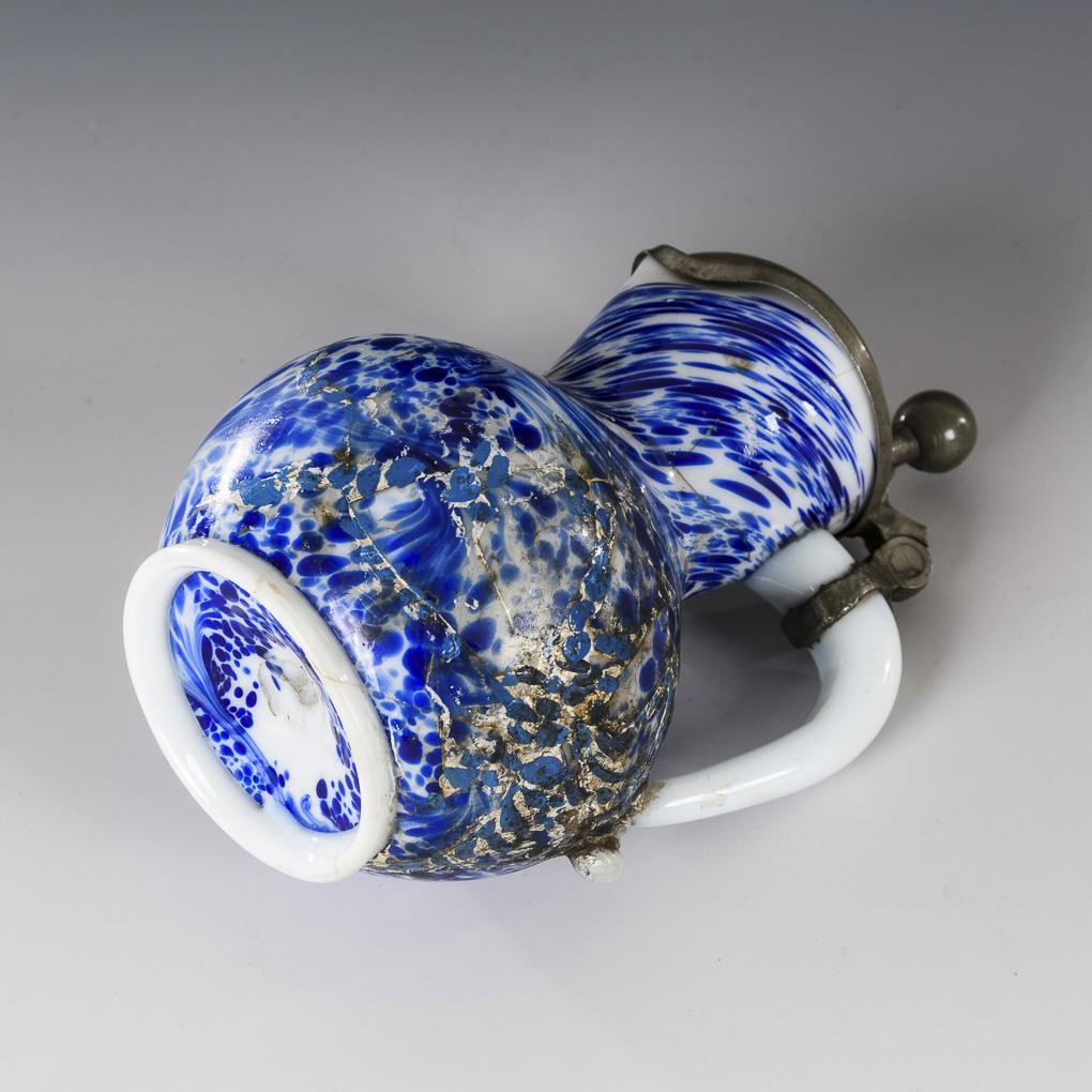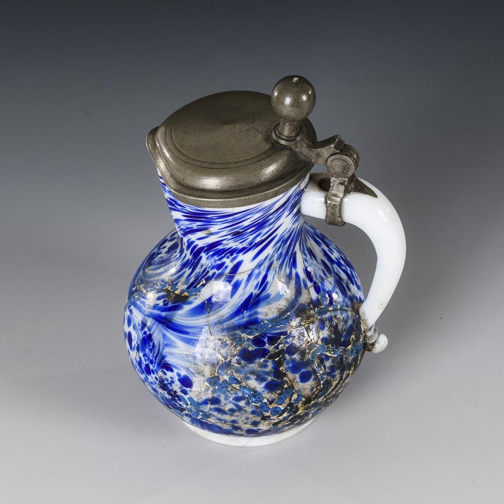 Kleiner bauchiger Krug mit zinnmontiertem Scharnierdeckel (H 15,5 cm) und Untertasse (Ø 12,5 cm). Krug restauriert.