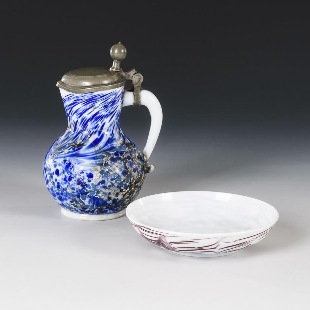 Milchglaskrug und -untertasse.