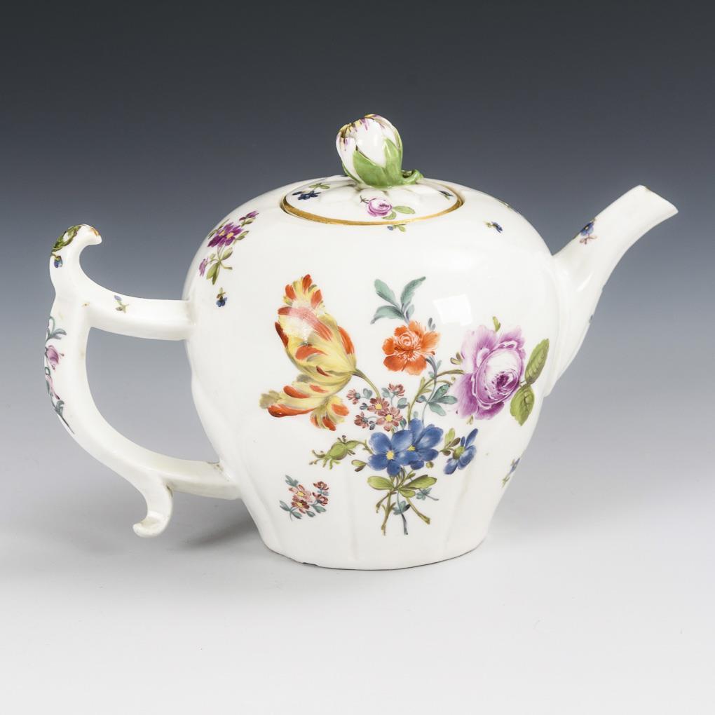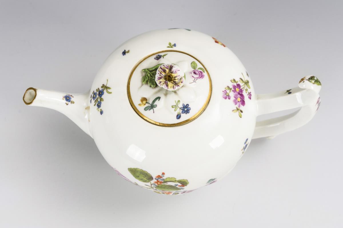 Teekännchen mit Zungenbändern am Stand, spitz gewinkeltem Henkel und Blütenknaufdeckel. Kleine Bestoßung am Blütenknauf und am Stand.