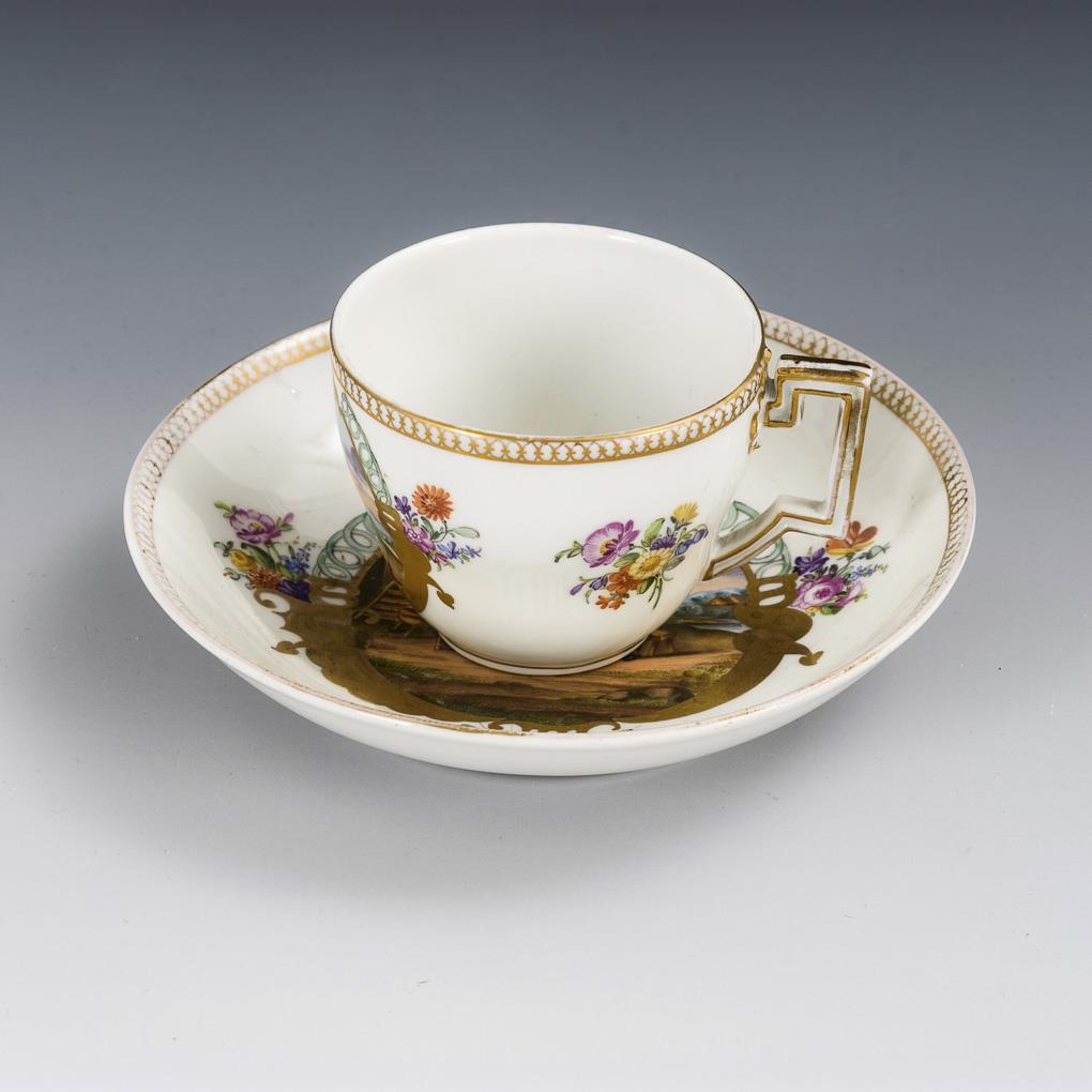 Polychrom bemalt, goldstaffiert. H Tasse 6 cm, Ø originale Untertasse 15 cm.
