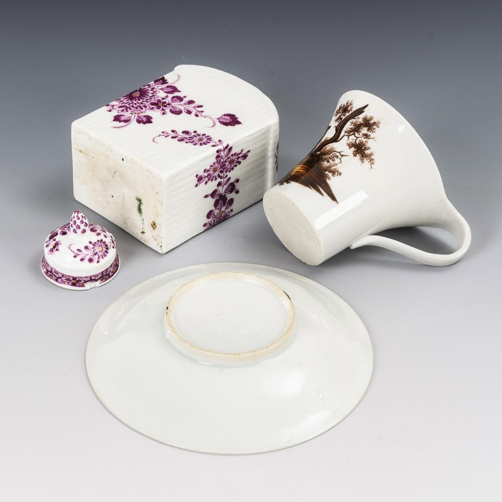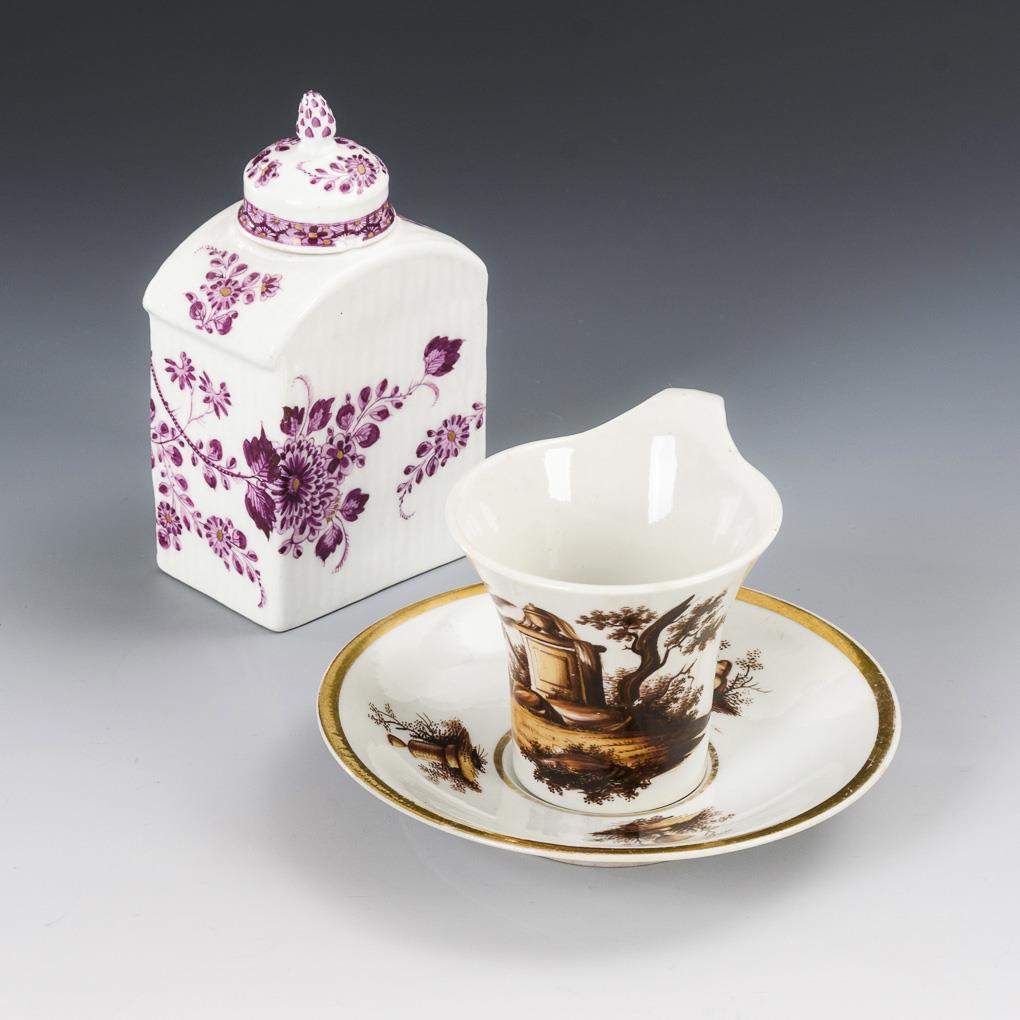 Kratertasse mit brauner Camaieumalerei: schauseitig die Darstellung einer Parklandschaft mit Urne auf einem Monument. / Teedose mit gebrochen gerippter Wandung und purpurfarben gemaltem Garbenmuster. Haarriss in der Tassenwandung, minimaler Goldabrieb, 2 Bestoßungen am Teedosendeckel.