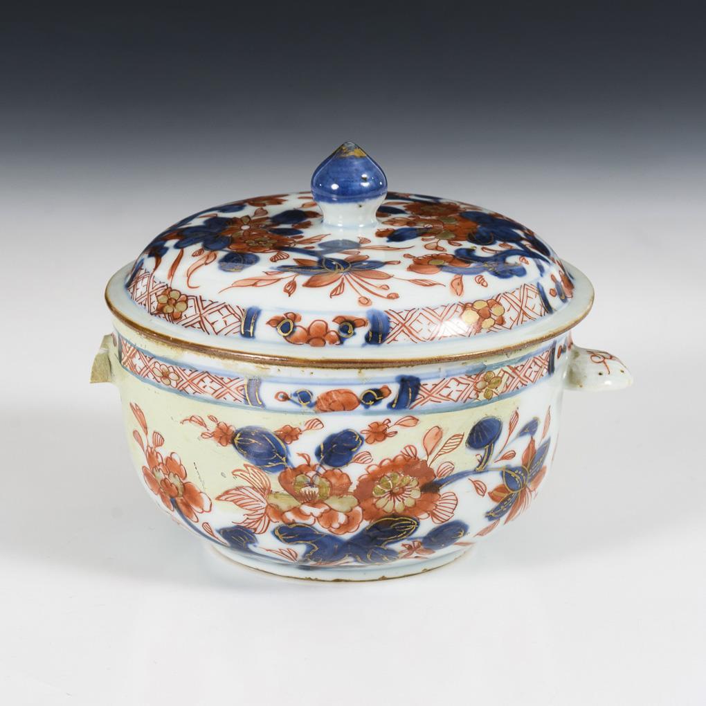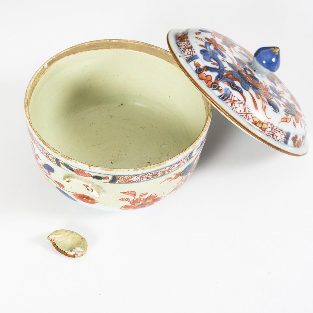 Schüssel mit zwei Handhaben und flacher Deckel im klassischen Imaridekor. Schüssel komplett restauriert, Lackierung nachgedunkelt. Eine Handhabe abgebrochen, aber vorhanden. Deckel unbeschädigt.