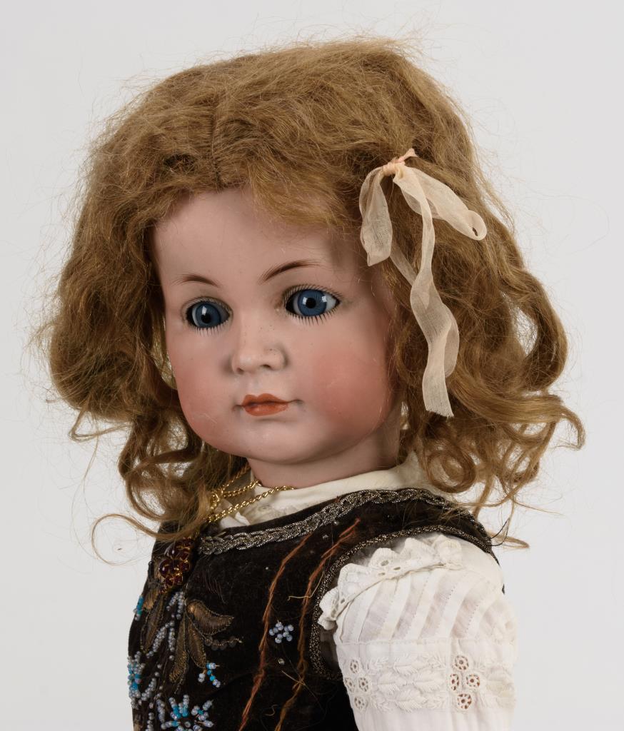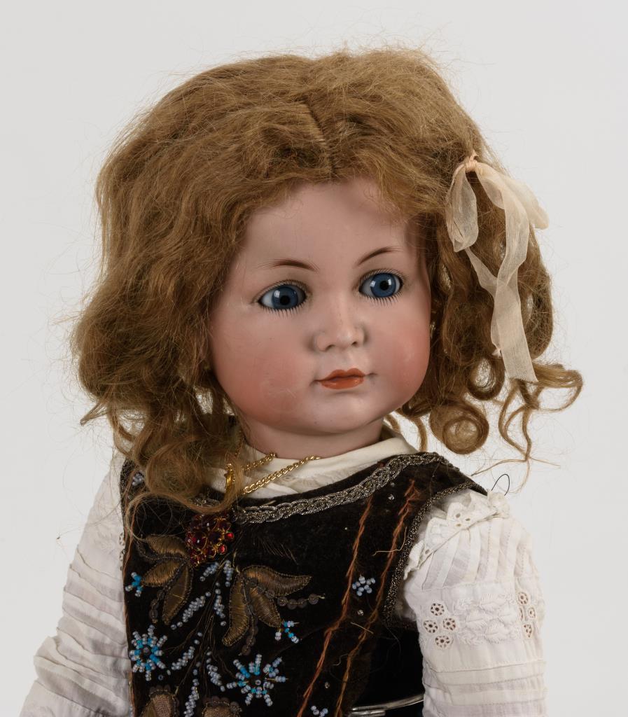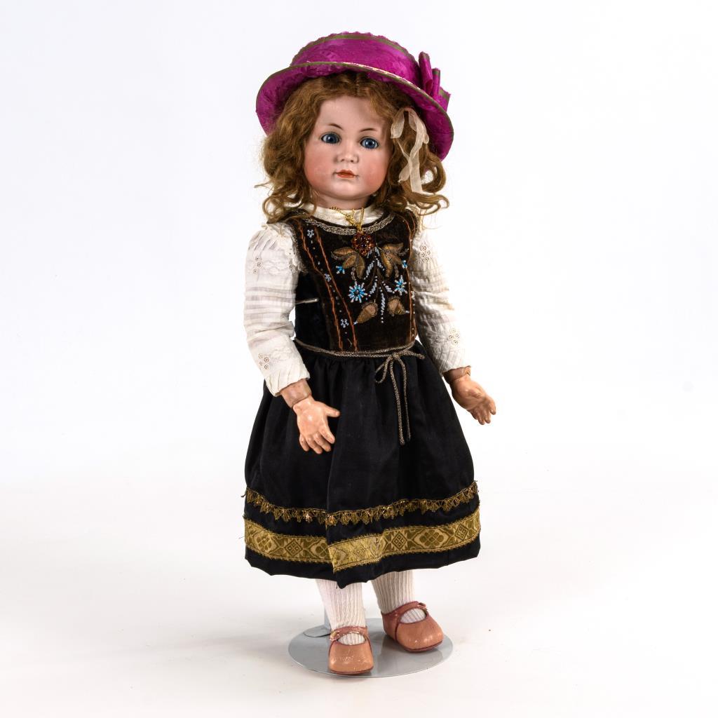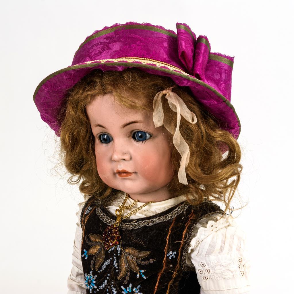Kurbelkopf aus Biskuitporzellan, blaue Schlafaugen, geschlossener Mund, blonde Mohairperücke. 15-teiliger Gliederkörper. Braunes Kleid mit Samtmieder, rosa Schuhe, Strohhut mit violettem Band. V-förmiger Haarriss am rechten Ohr, Körper partiell berieben, kleine Bestoßungen.