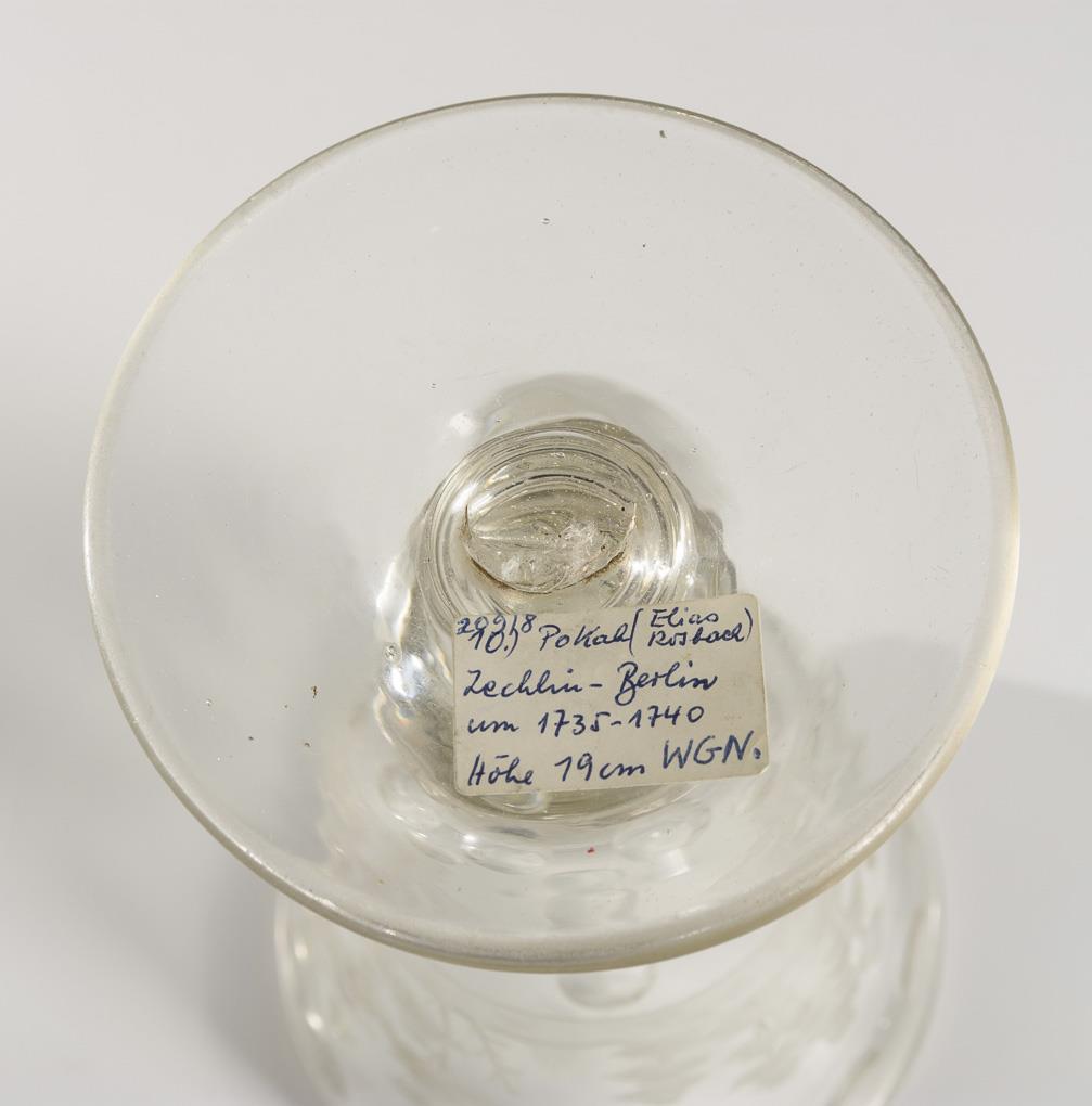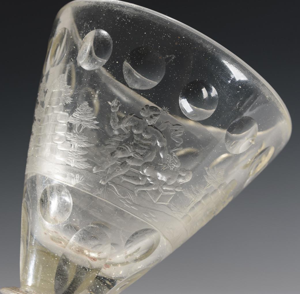 In der Art von Elias Rosbach gestaltetes Glas mit konischer Kuppa, Balusterschaft und Rundfuß. Unter einem großen Kugelfries eine umlaufend gravierte Landschaft mit der Darstellung der Venus, den Amorknaben bestrafend. Ausbruch am Scheibennodus.