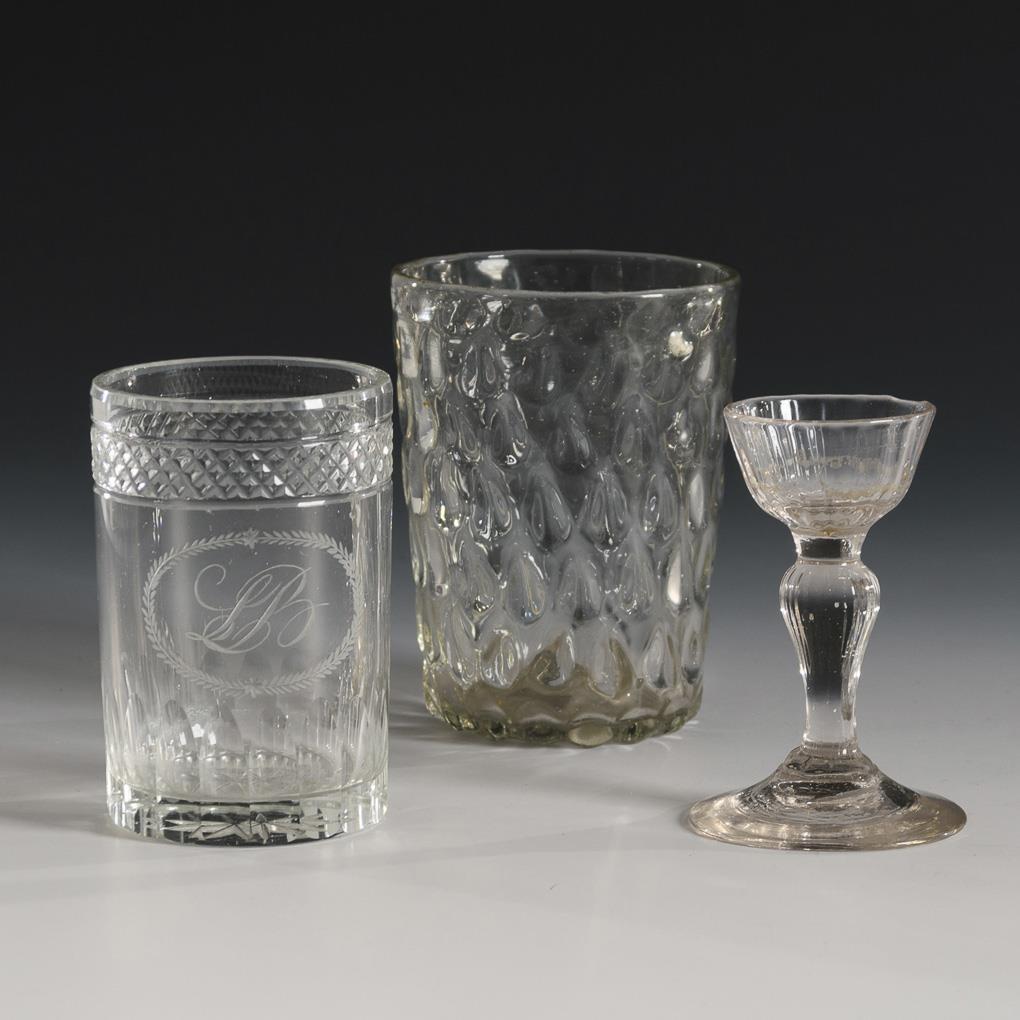 1x wabenoptisch geblasener Becher (H 10 cm), Zylinderbecher mit Schliffdekor und dem gravierten Monogramm "LB" (H 8,5 cm) und 1x längsoptisch geblasenes, kleines Kelchglas (Augenglas?; H 8,5 cm). Mündungsrand des Zylinderglases mit minimalen Bestoßungen.