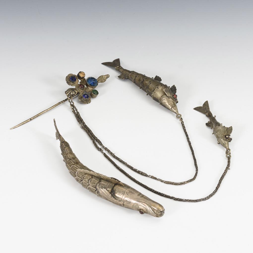 Fisch mit roten Glasaugen. / Anstecknadel mit Farbsteinen sowie Geier und Hand, daran 2 Ketten mit kleineren Fischen. Altersspuren, 1 Glasstein fehlt.