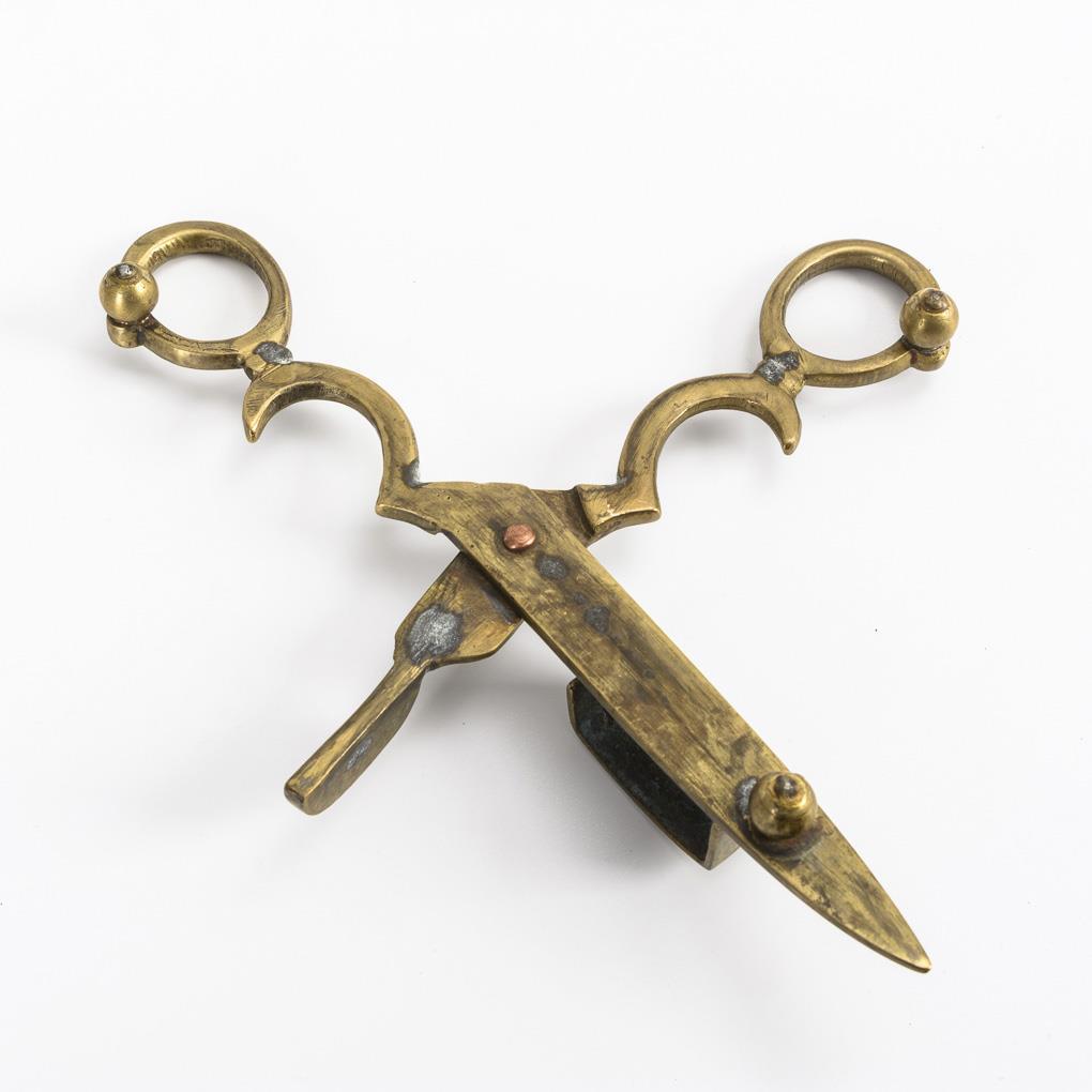 Lichtputzscheren verschiedener Größe. Die große verchromte steht auf Rädern, die vernickelte hat Zusatzfunktionen. 1x fehlende Füße (kleiner Ausbruch), zumeist starke Alters-/Gebrauchsspuren.