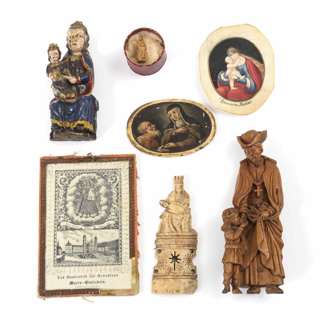 Bein-Applikation mit Pieta über Ornament-Sockel. / Mann mit Kind. / Thronende Madonna mit Jesuskind 1x gefasst und 1x als Miniaturschnitzerei. / Elfenbeinminiatur: Heilige Nonne (Theresa oder Hedwig) mit bärtigem Mann. / Pergamentminiatur: "Sucurre Maria" (Maria Hilf). / Lithografie: Gnadenbild "Maria Einsiedeln". Teils Fehlstellen und Ausbesserungen, Fassung übergangen, Alters-/Gebrauchsspuren.