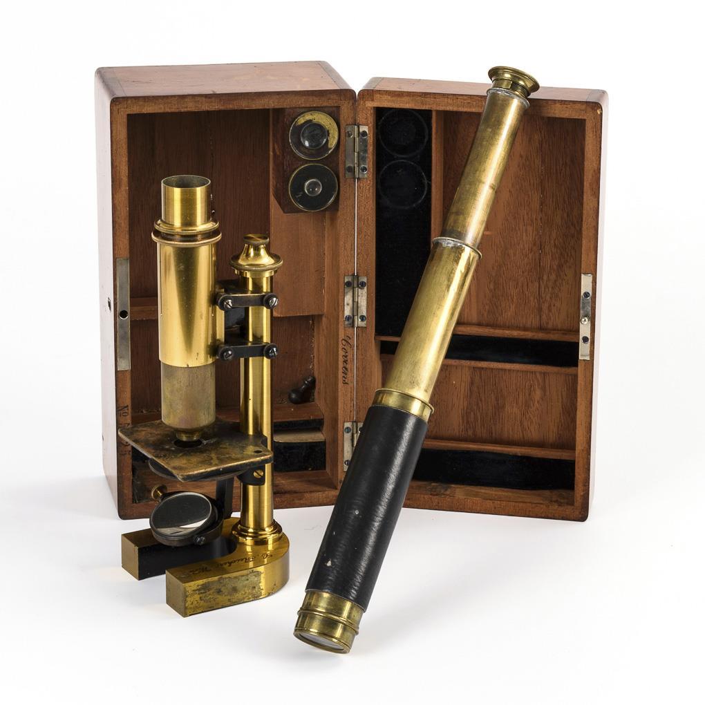 Messing-Mikroskop mit zweifachem Spiegel und drehbarer Lochplatte. Zwei austauschbare obere Linsen. Federmechanismus zum scharf stellen. / Dazu Fernrohr mit vier Auszügen und Lederummantelung L max. 41 cm. Passt in den Kasten mit hinein, gehört aber wohl nicht original dazu. Untere Linse fehlt, Trägerplatte etwas angelaufen. / Fernrohr mit kleiner Fehlstelle an der Linsenfassung.