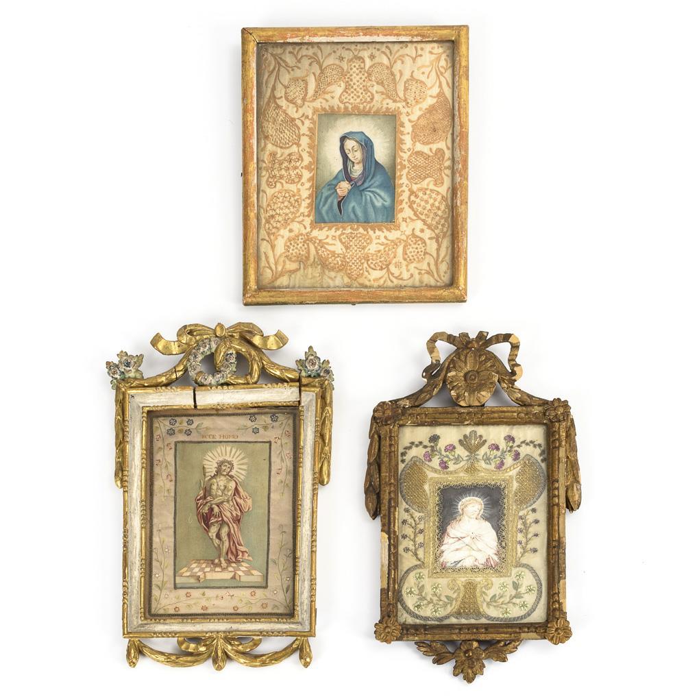 Christus im Elend, "Ecce Homo" bzw. betende Maria. Je florale bzw. ornamentale Rahmung sowie verglaste Rahmen (2x mit Schnitzerei). Fehlstellen und Klebespuren an den Rahmen, teils stärkere Alters-/Gebrauchsspuren.