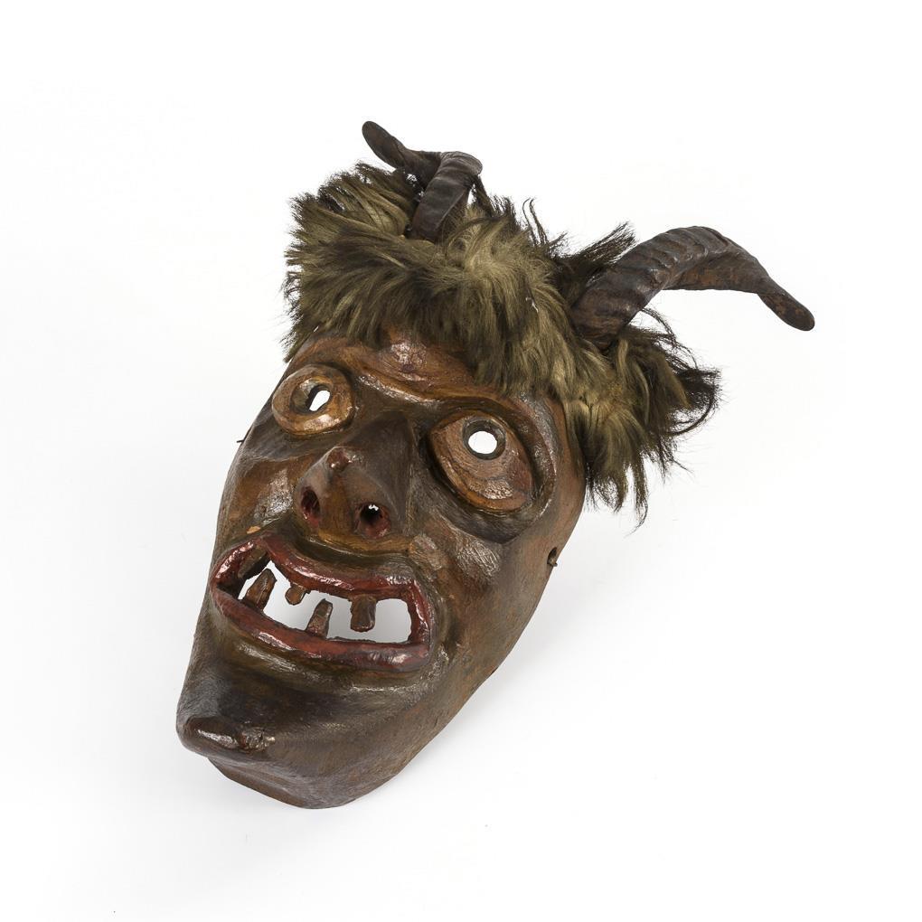 "Teuflische" Brauchtumsmaske für den Begleiter des Nikolaus. Ausbruch und Trockenriss am Rand, 1 Horn mit Rissen locker.