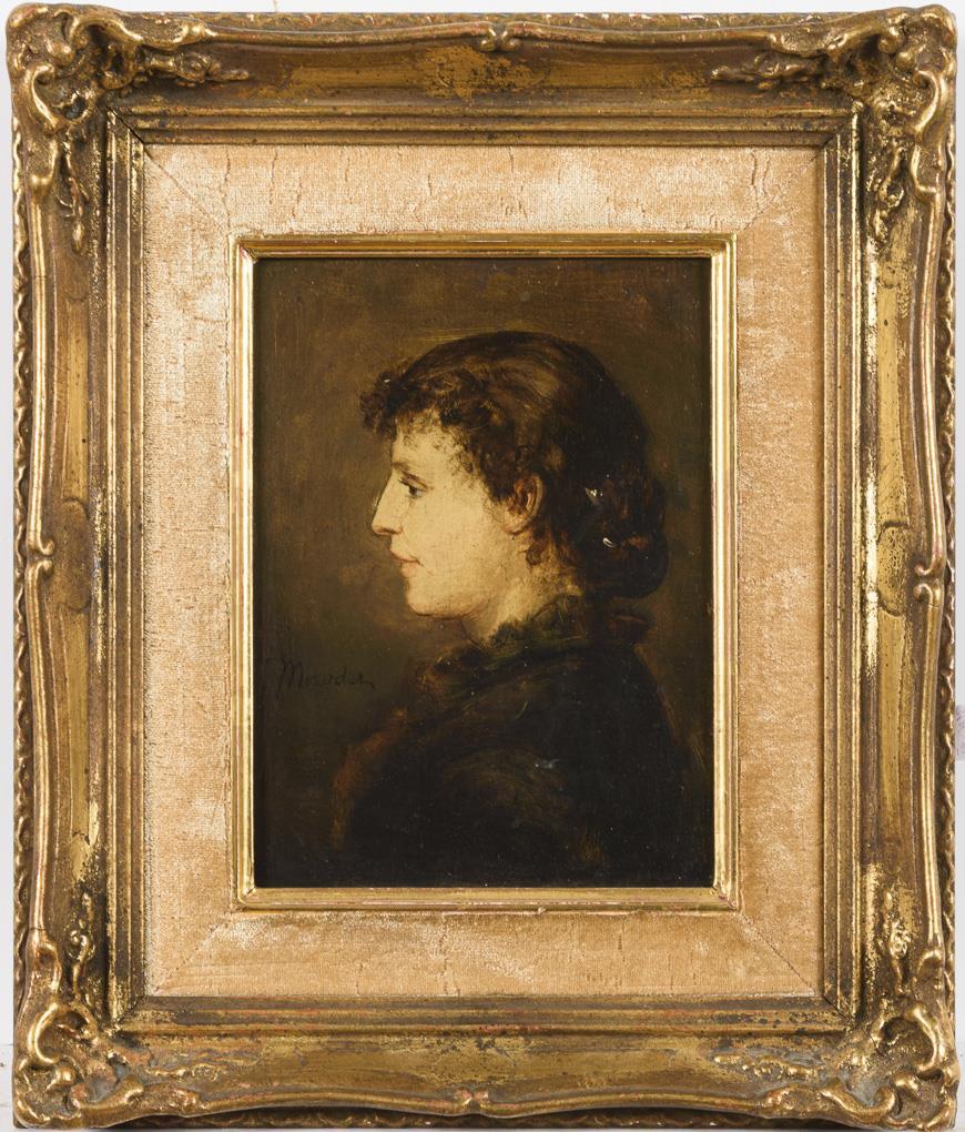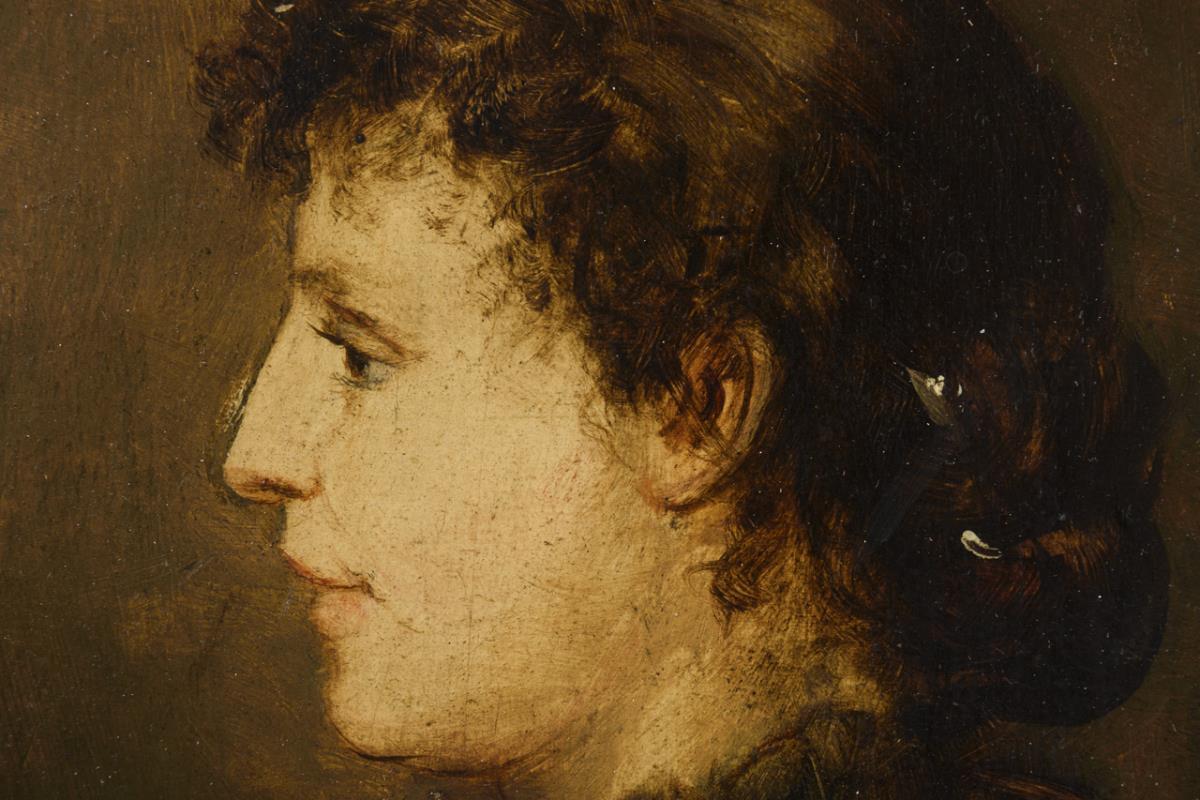 Profilbildnis einer jungen Frau mit gelocktem Haar und dunklem Kleid. Leichte Altersspuren.