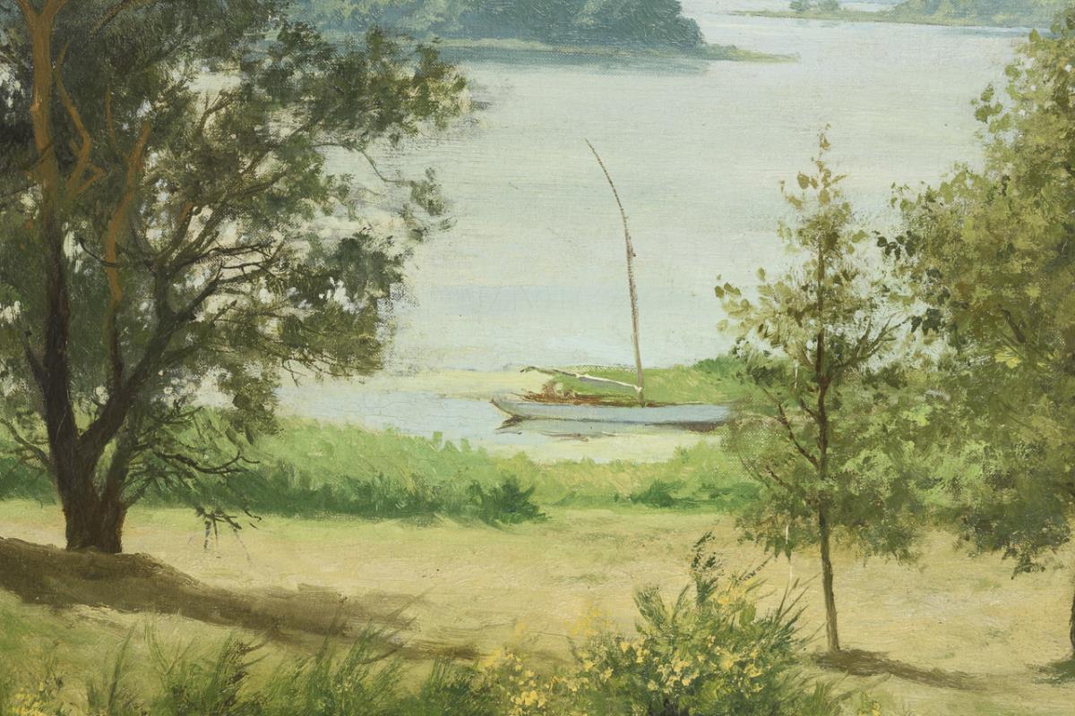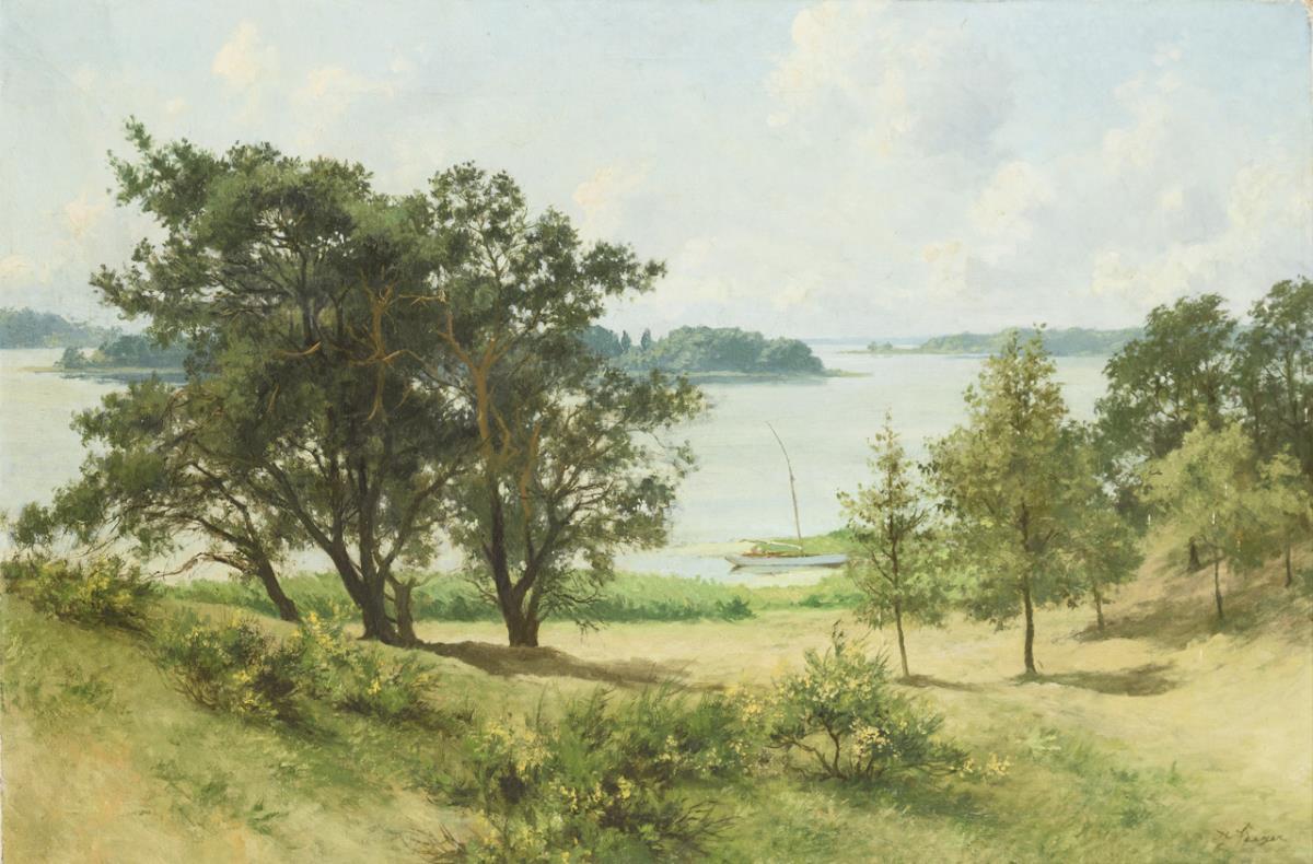 Weite sommerliche Gegend mit vielen Bäumen am Ufer des Sees.