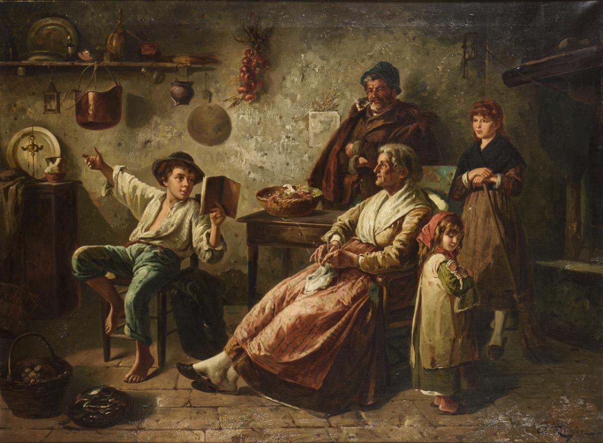 Mit ausladender Geste vorlesender Junge in der Stube mit der gespannt lauschenden Familie. Leichte Altersspuren.