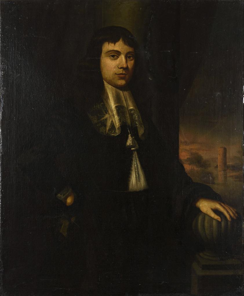 Porträt einer Dame im schwarzen Kleid mit weißer Spitze vor einer Balustrade mit Blick in eine bergige Abendlandschaft. Bildnis eines jungen Mannes in dunkler Kleidung mit Spitzenkragen auf einem Balkon mit Blick in eine abendliche Landschaft. Je Leinwand doubliert, Altersspuren.