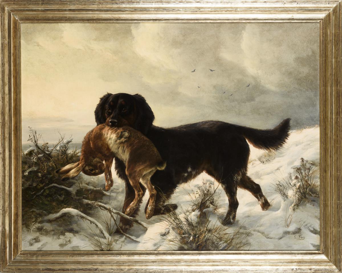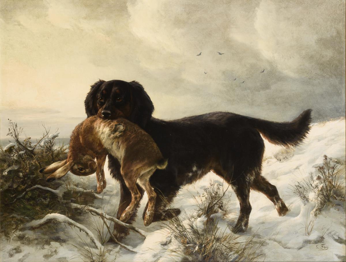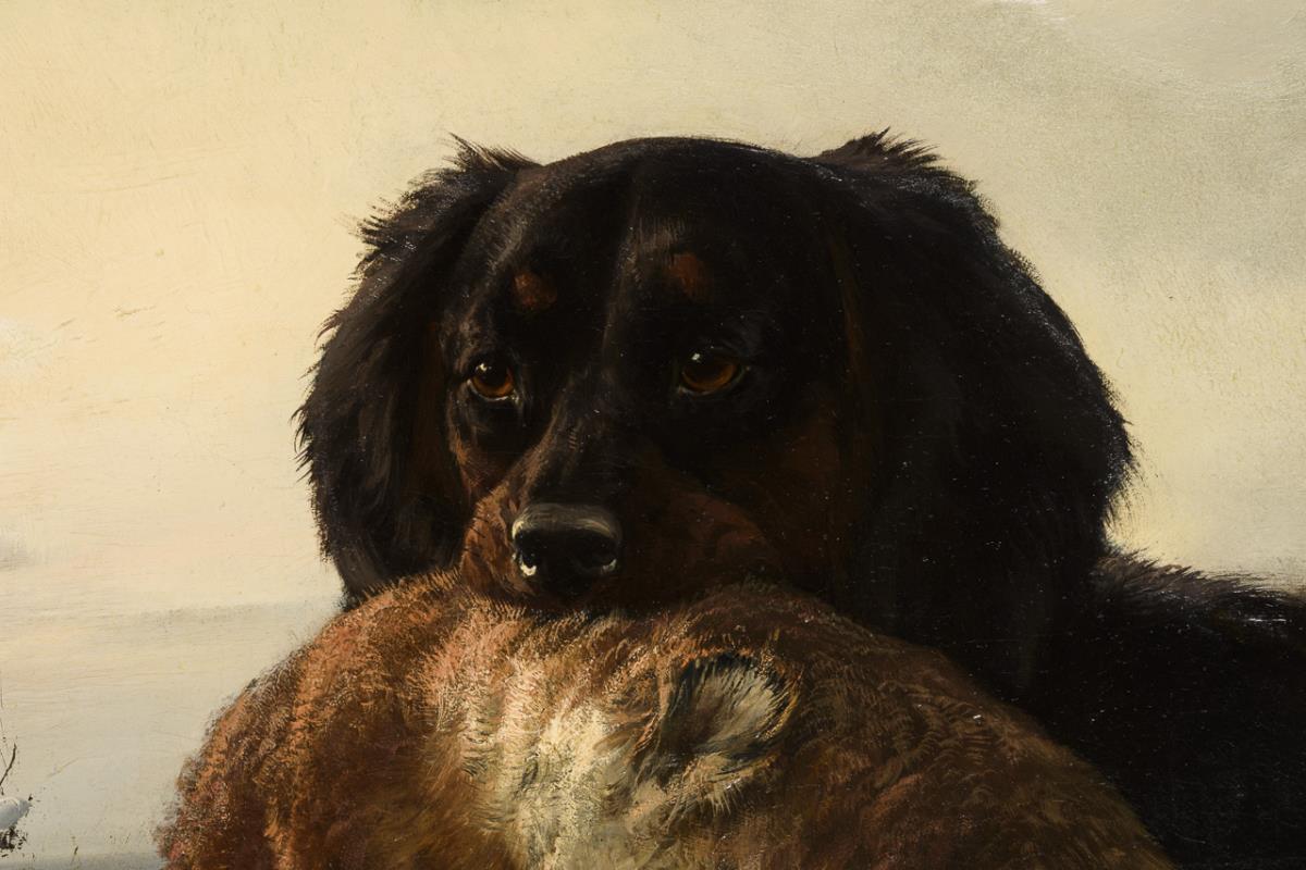 Qualitätvolle Darstellung des Hundes mit dem Hasen im Maul auf verschneitem Hügel im milden Sonnenschein. Leinwand doubliert.