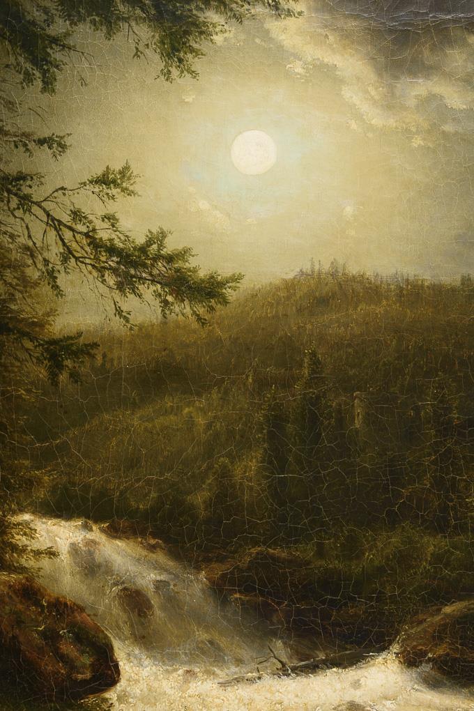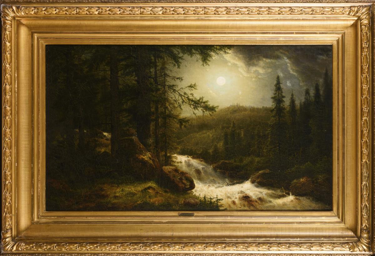Reißender Fluss zwischen den hohen Tannen bei hellem Licht des Vollmondes. Leinwand wachsdoubliert.