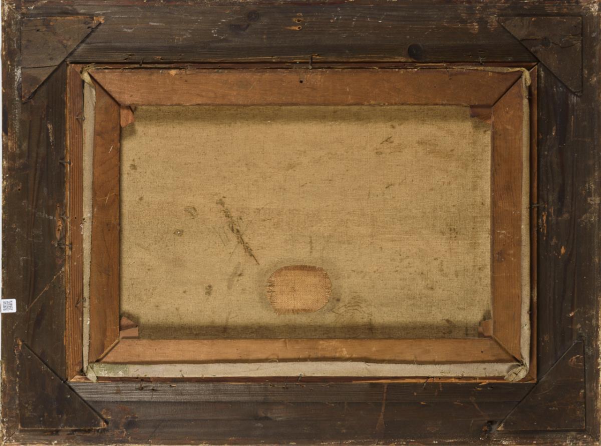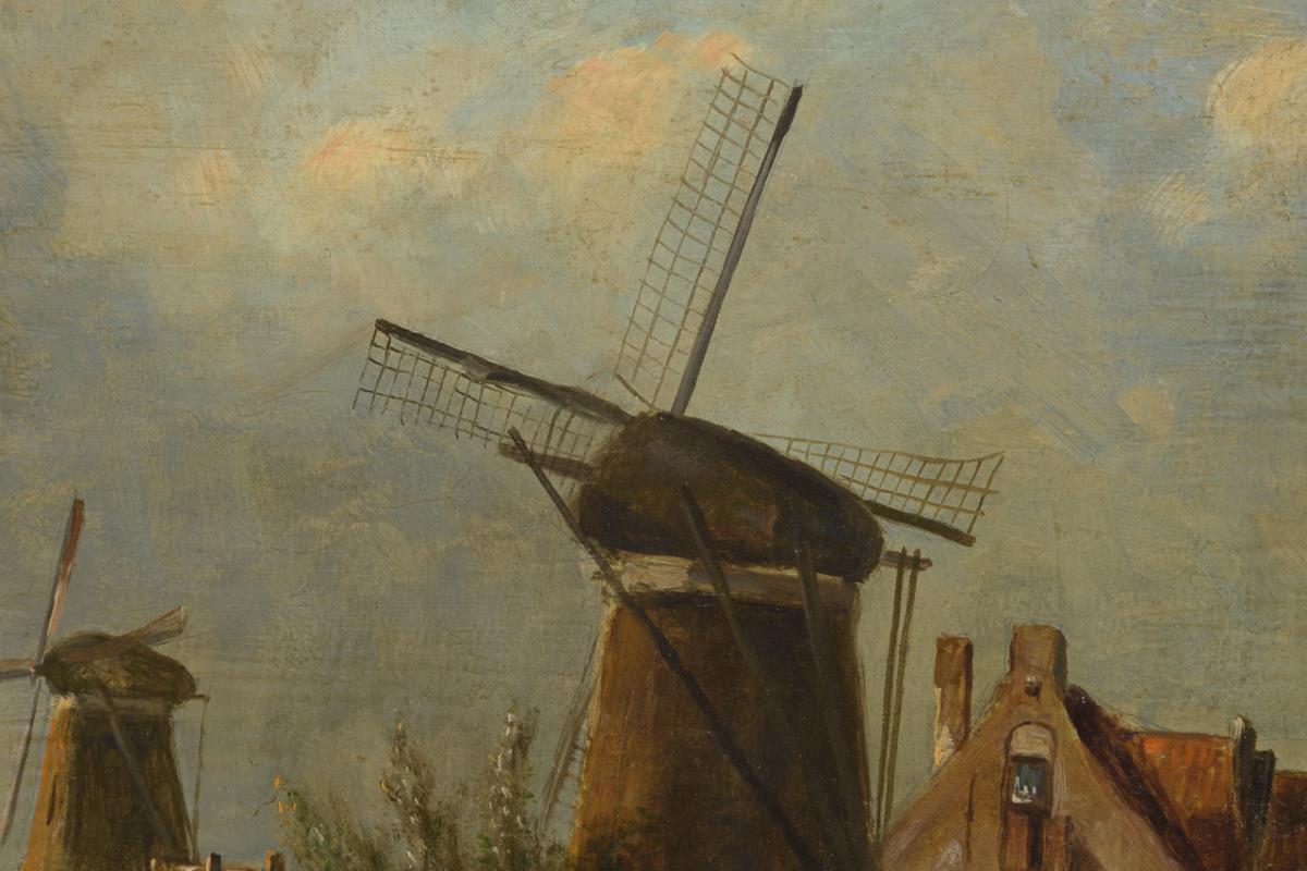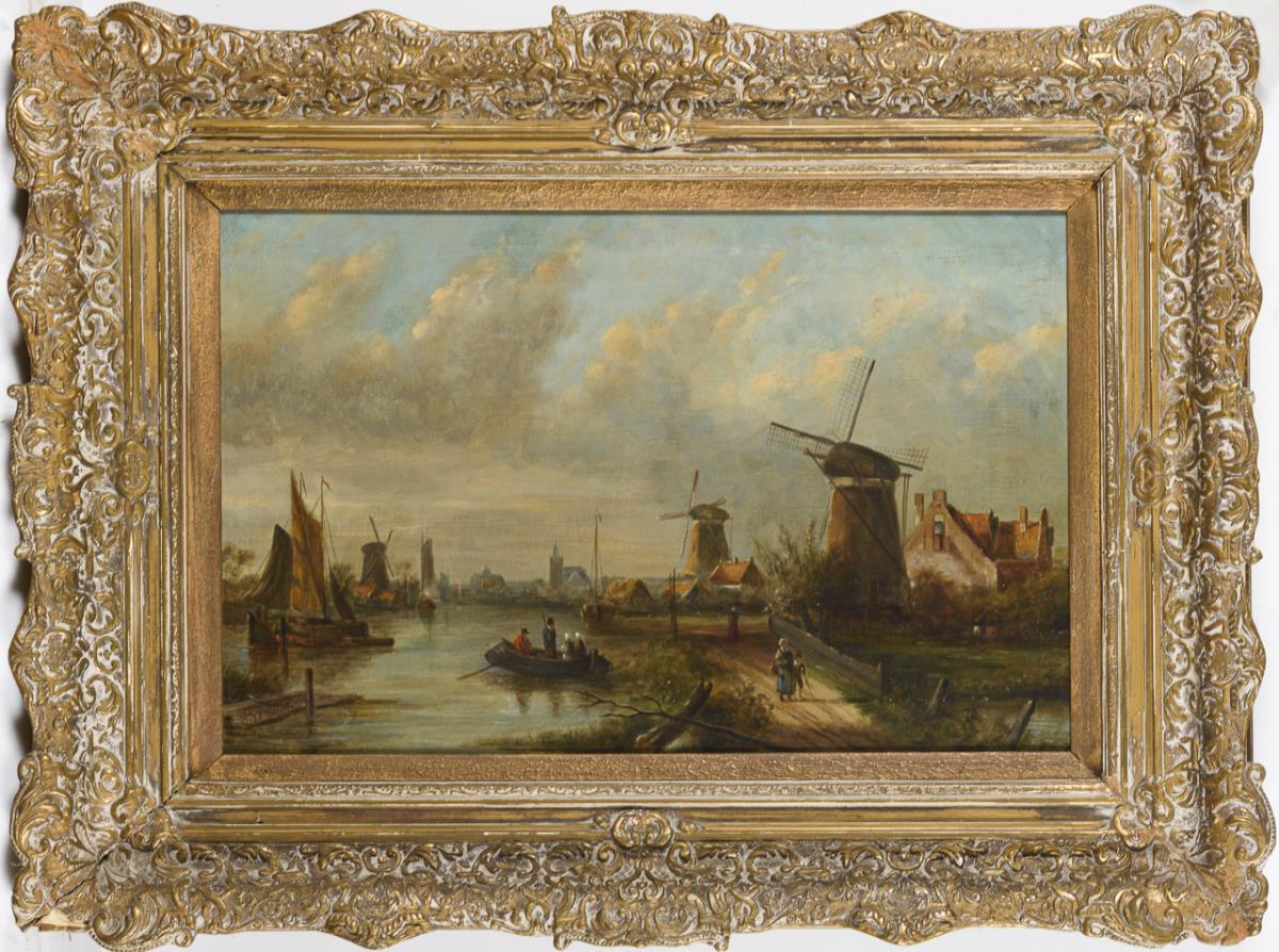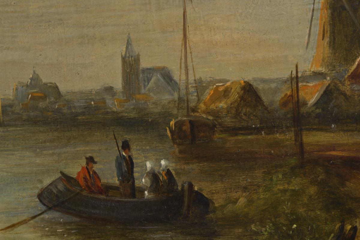 Staffagefiguren in den Booten und am Fluss im Sonnenschein am Rand der Stadt. Restauriert mit einer Hinterklebung.