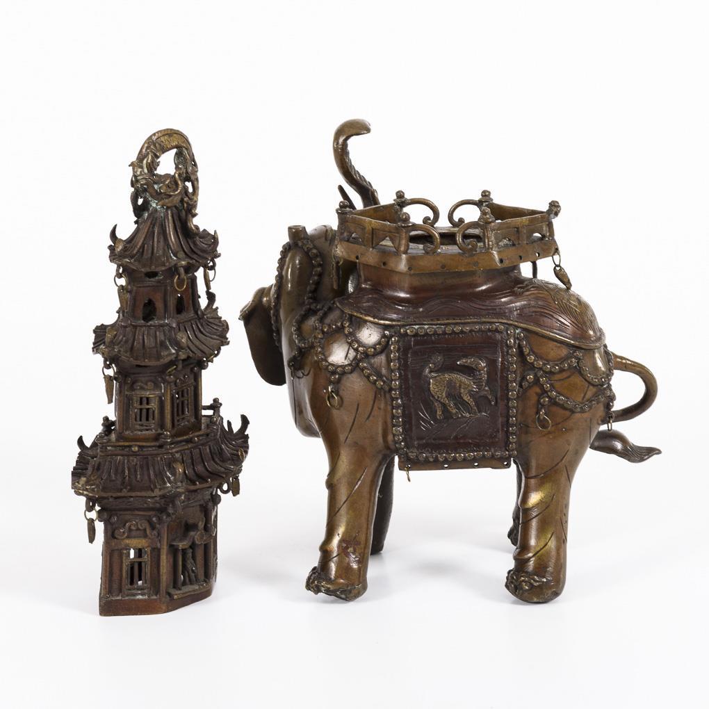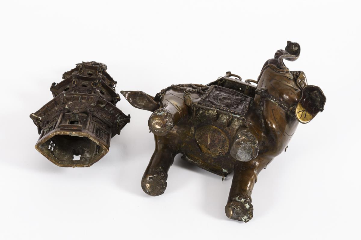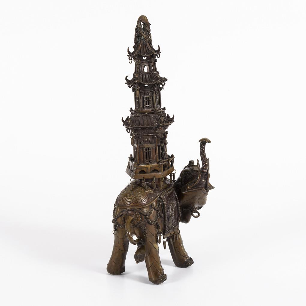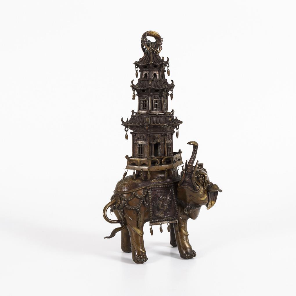 Reich verzierter Elefant mit vieretagiger Pagode auf dem Rücken. Vielfältige Relief- und Gravur-Verzierungen sowie Abhängungen, Drachen, Minogame, Phönix. Durchbrochen gearbeiteter Turm abnehmbar. Auf dem Kopf Einsteckmöglichkeit. Einige Abhängungen fehlen.
