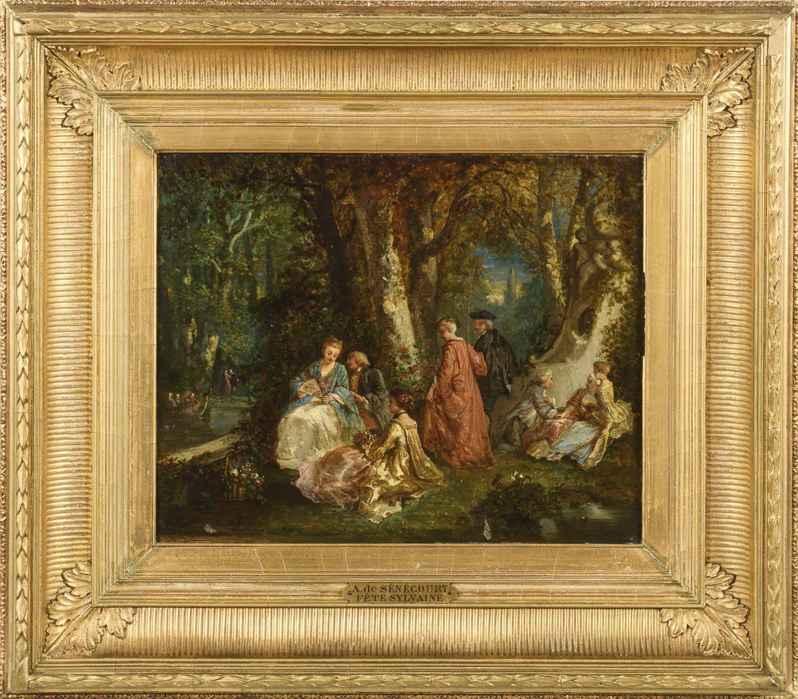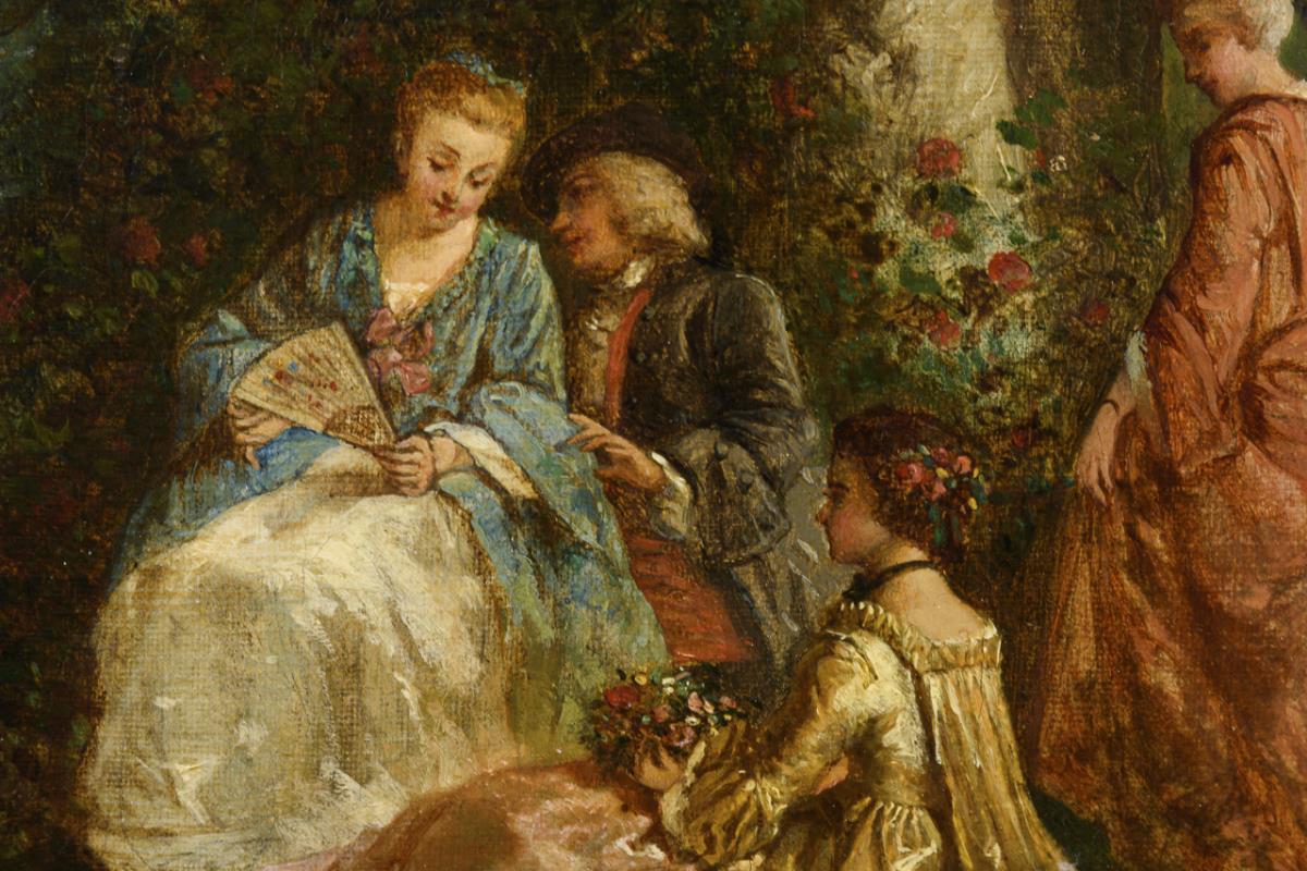 Mehrere Personen in der Mode des 18. Jahrhunderts an verschiedenen Stellen im Park. Leinwand doubliert.