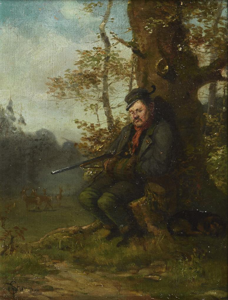 Erschrocken am Fuchsbau stehender Jäger mit Hund bzw. Schlafender Jäger an einem Baum.