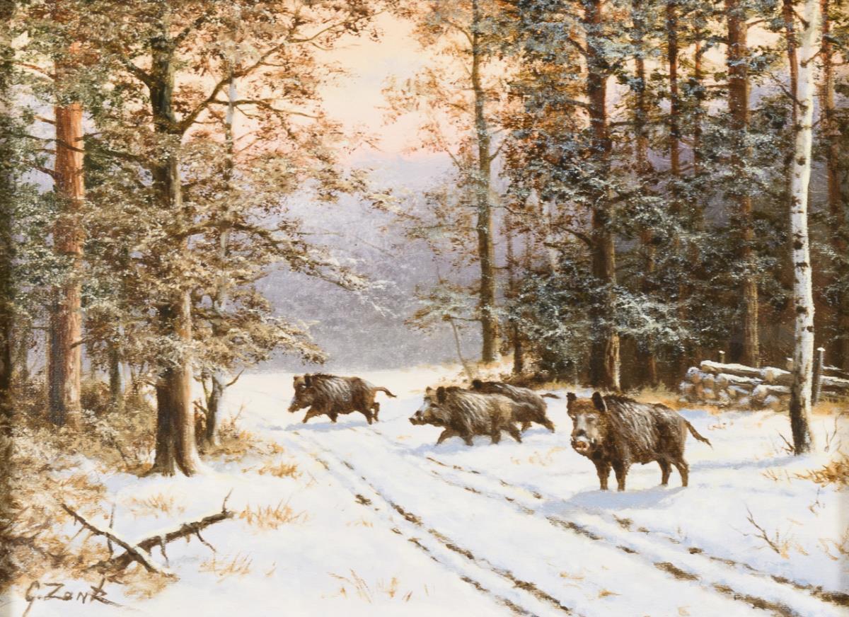 Rehe auf verschneitem Feld am Waldrand, Wildschweine im Winterwald und zwei Birkhähne in karger Landschaft.