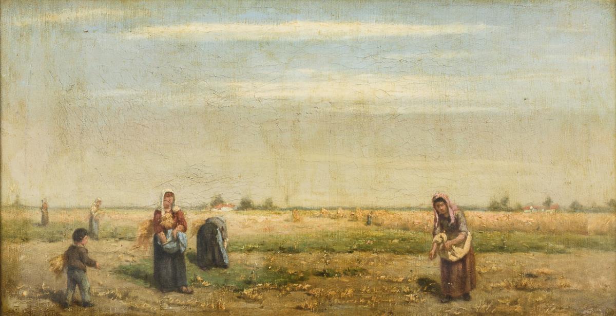 Die Bauern beim Sammeln der Ähren auf dem Feld im Sonnenschein. Altersspuren.