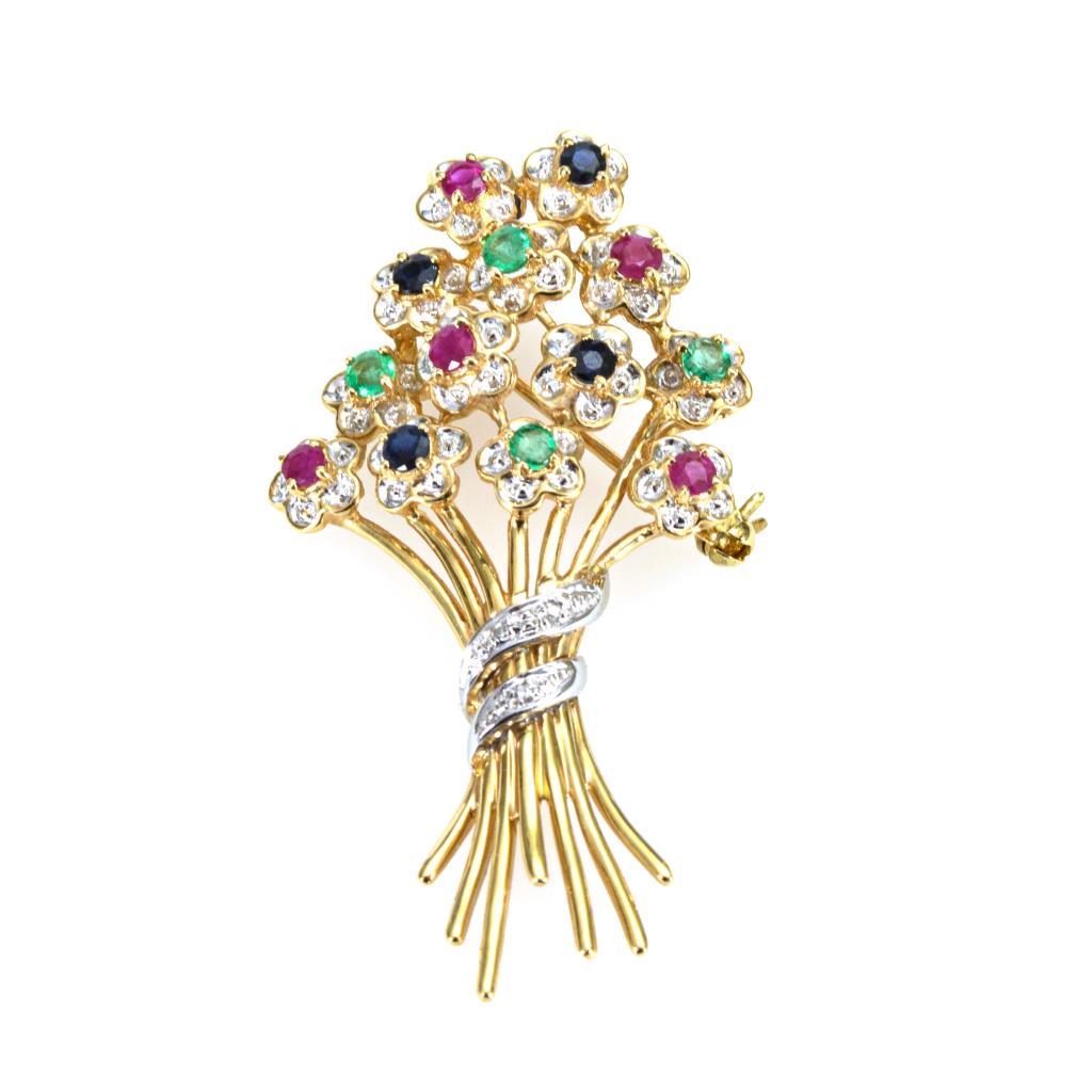 Blumenstrauß mit 4 kleinen Saphiren, 4 Smaragden, 5 Rubinen und 3 Diamanten. Kugelhaken.