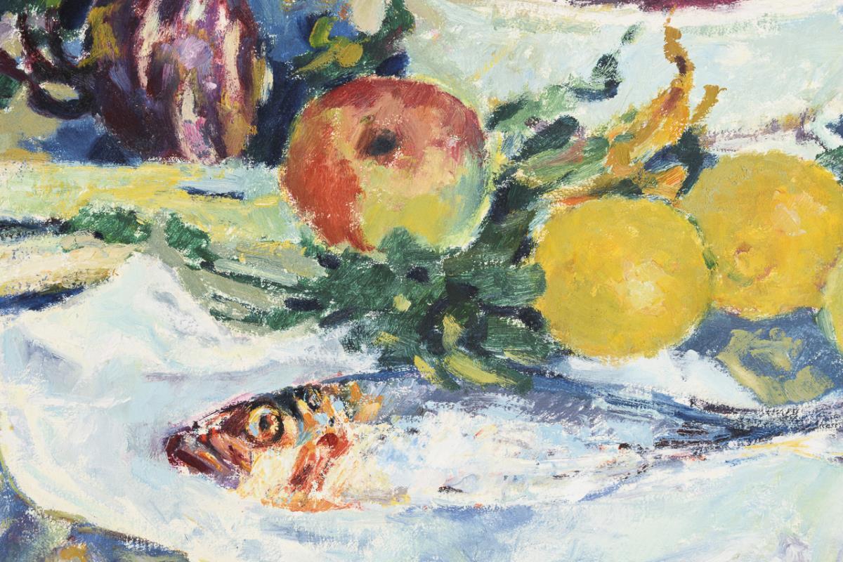 Expressives Stillleben mit Äpfeln und verschiedenem Gemüse auf einem Tisch neben einem Fisch.