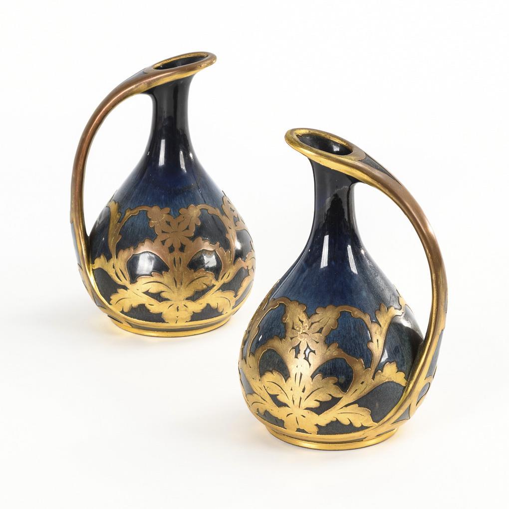 Paar Jugendstil-Enghalskannen mit Metallmontierung. Merkelbach & Wick, Grenzhausen.