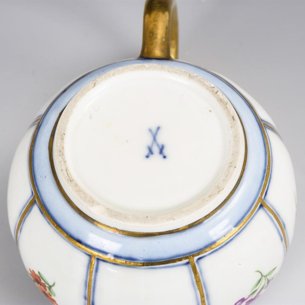 Kugeliges Kännchen mit achtfach segmentierter Wandung, Röhrenausguß und Knaufdeckel. Minimale Bestoßung am Standring.