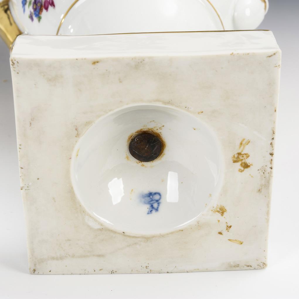 Amphorenvase mit Kraterhals, zwei Löwenkopfhenkeln und Rundfuß, auf Quadratplinthe. Partieller Goldabrieb, Montierung locker.