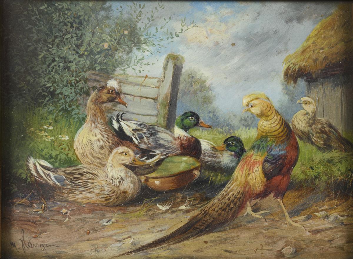 Die Tiere im Sonnenschein bei der Trinkschale. Kleine Farbabsplitterungen.