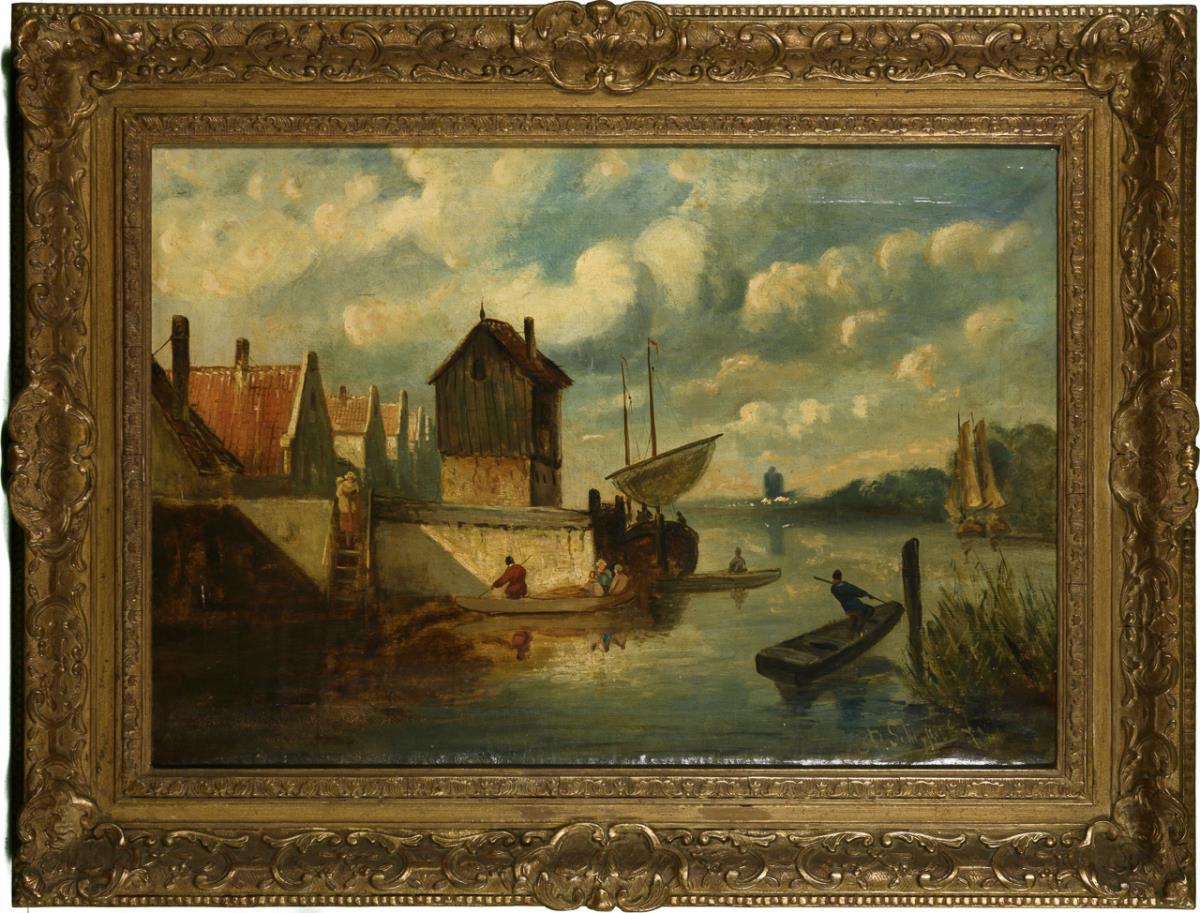 Fischer in den Booten nahe den Häusern der Stadt. Anbei holländische Expertise von 1991. Altersspuren.