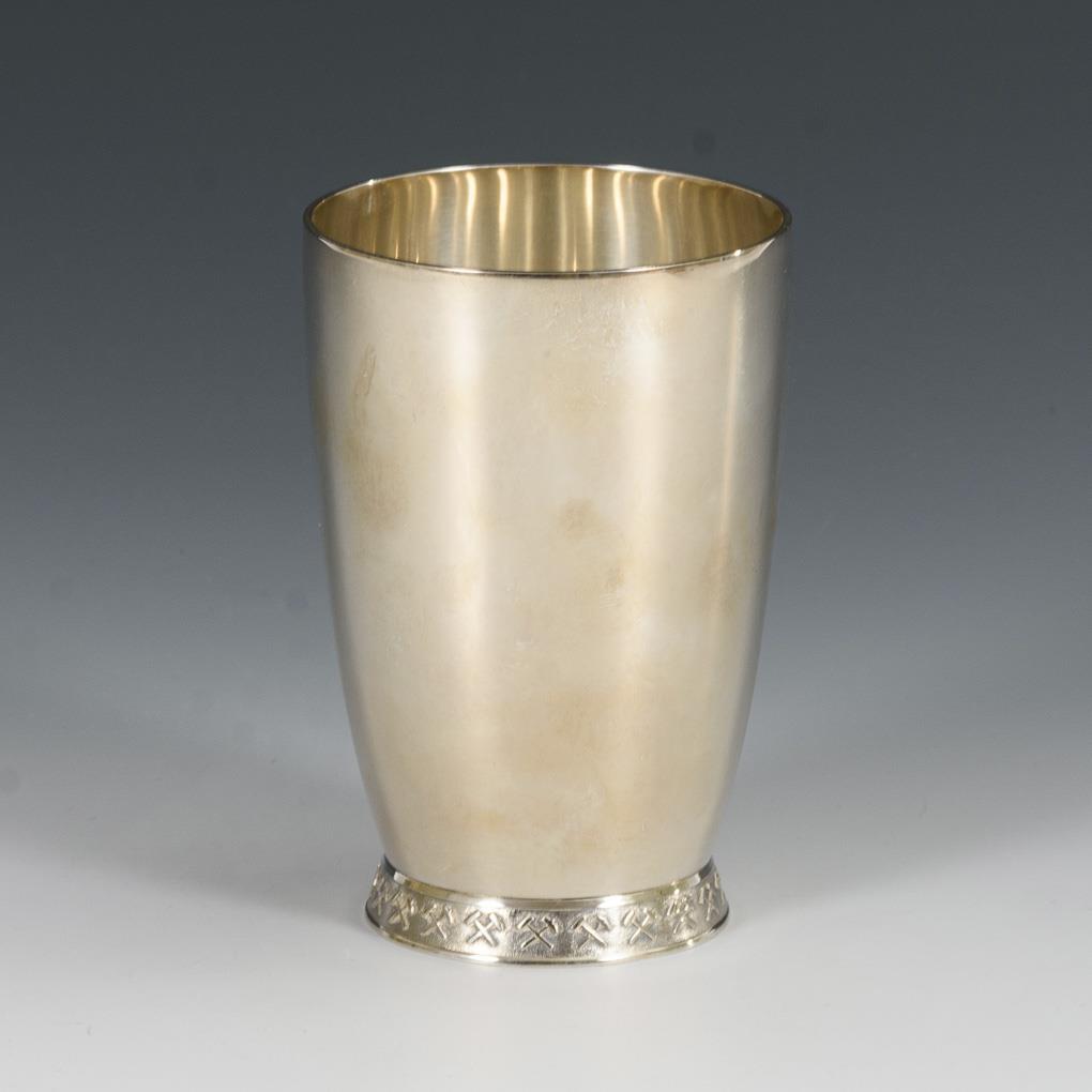 Glatter Becher mit umlaufendem Relief gekreuzter Hammer am Standring.