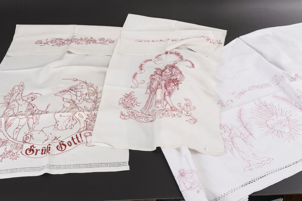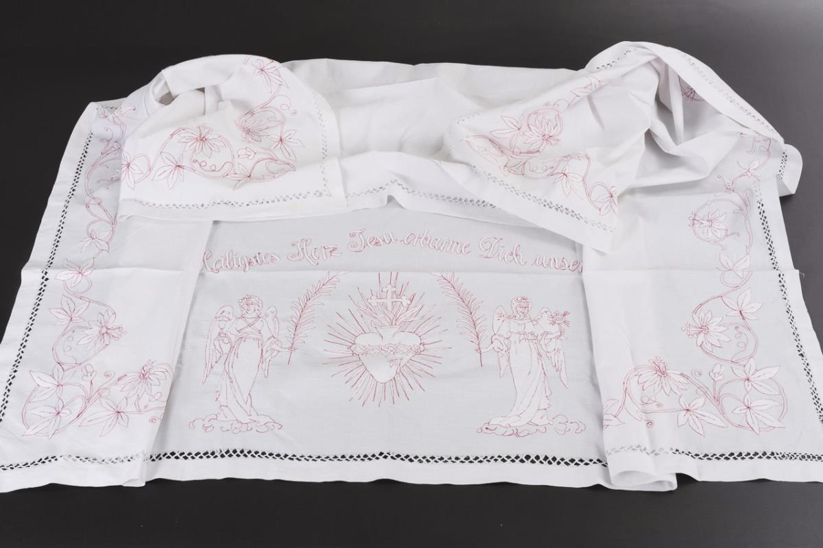 Altartuch mit rotweißem Herzjesu-Motiv, 2 Überhandtücher mit Motiven aus dem Hause Wittelsbach mit Stickereien.