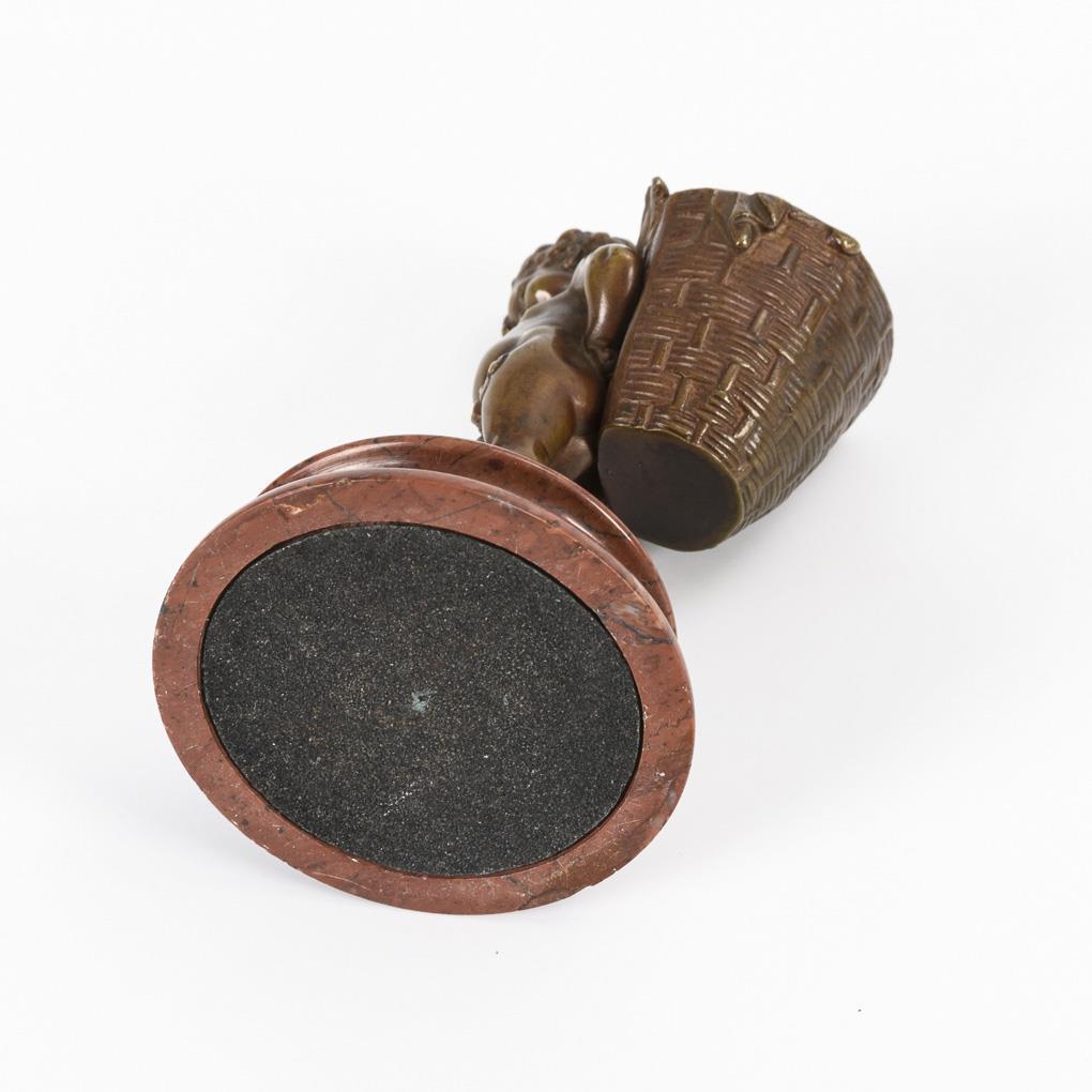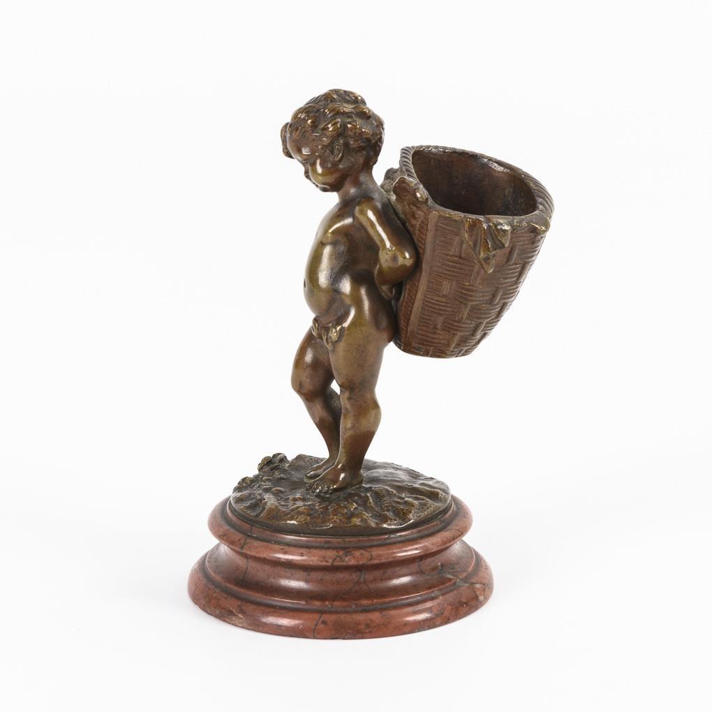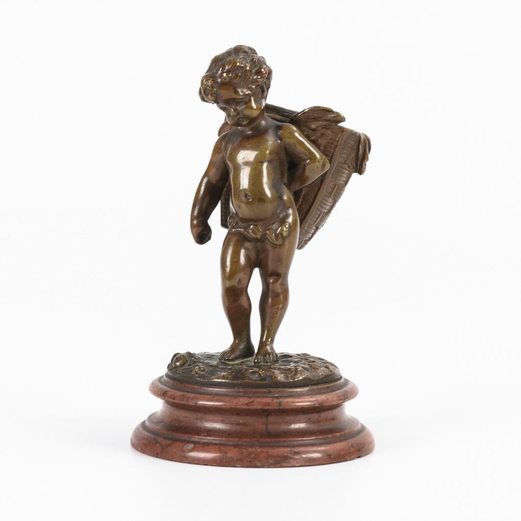 Stehender Amor mit Kiepe auf dem Rücken (Fidibushalter?). Patina berieben, Attribut in der Hand fehlt.