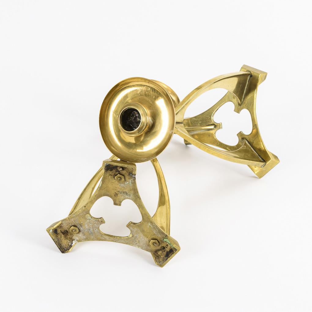 3-seitiger Sockel mit 3 zusammengeführten Schaftbögen sowie Tropfschale. 1 Tüllen-Pressring fehlt (Tropfschale dadurch lose), wenige Alters-/Gebrauchsspuren.