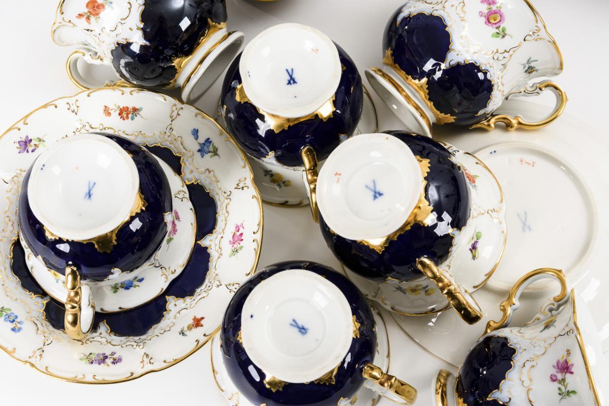 Kobaltblauer Teilfond, polychrome Blumenmalerei, Goldstaffage.