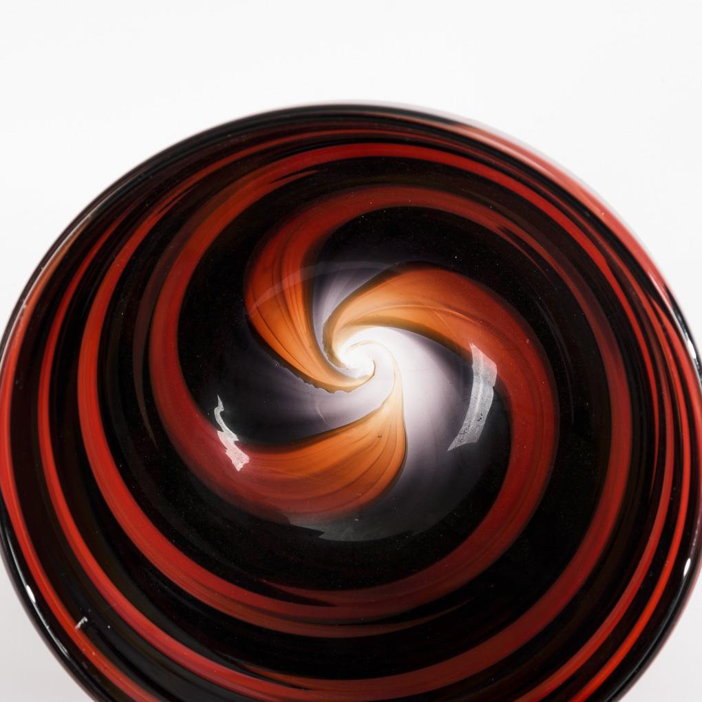 Farbloses Glas mit einem spiraligen, roten und schwarzen Innenfang. H 11 cm.