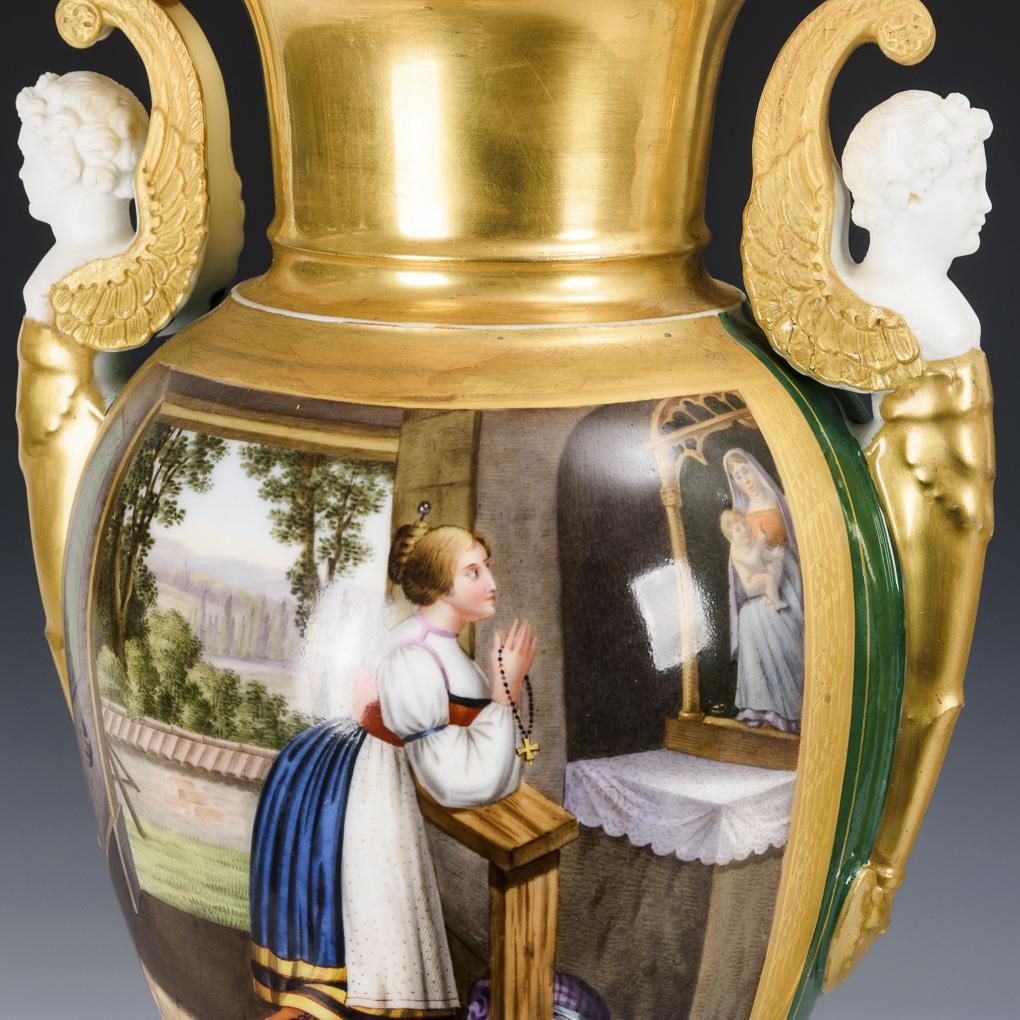 Ovoide Vasen mit Kraterhals, zwei Engelskopfhandhaben und Rundfuß, auf Quadrathplinthe. Schauseitig eine Rechteckkartusche mit den fein gemalten Darstellungen einer an einem Tisch sitzenden Mutter mit ihrer Tochter, bezeichnet "Muttertreue" bzw. einer jungen, vor einer Madonna betenden Frau, bezeichnet "Andacht". Bei beiden Korpusansatz und Wandung verso restauriert, 1x Handhaben restauriert.