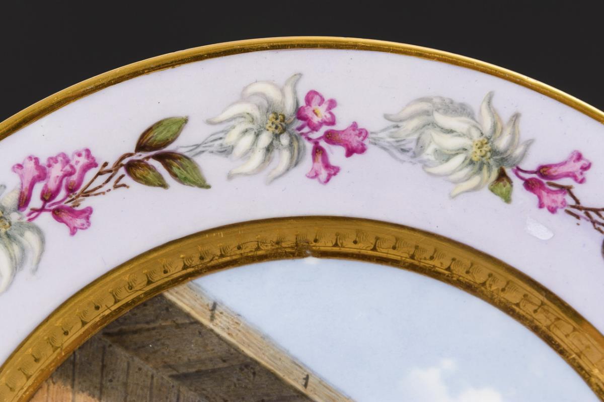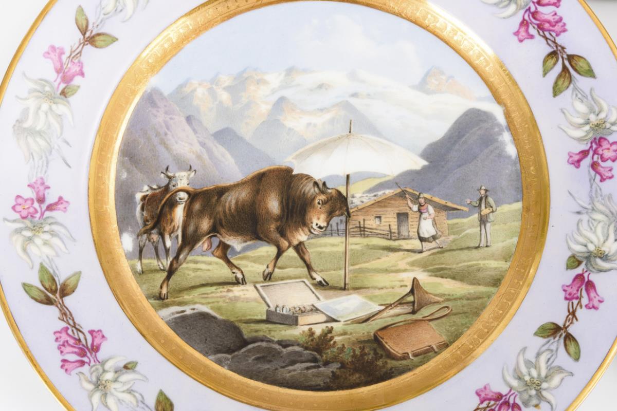 Flache Teller mit einem Blumenband mit Edelweiß auf dem violetten Fahnenfond, im Spiegel alpine Motive mit Figuren. Partiell minimaler Farb- bzw. Goldabrieb.
