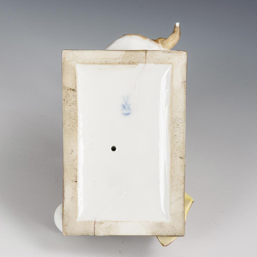 Sich auf einen liegenden Stier stützender Putto. Bestoßung am Tuch des Putto, 2 Brandrisse im Sockel.