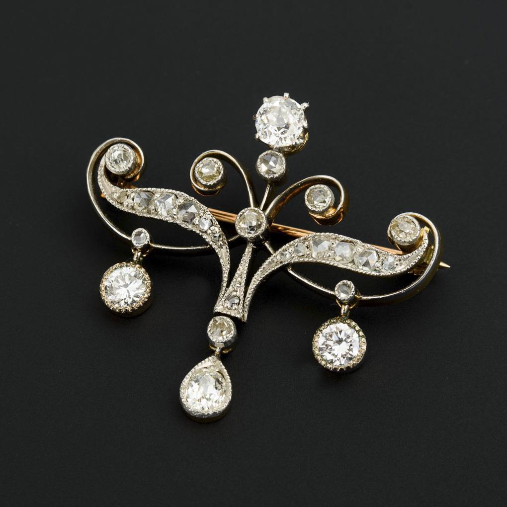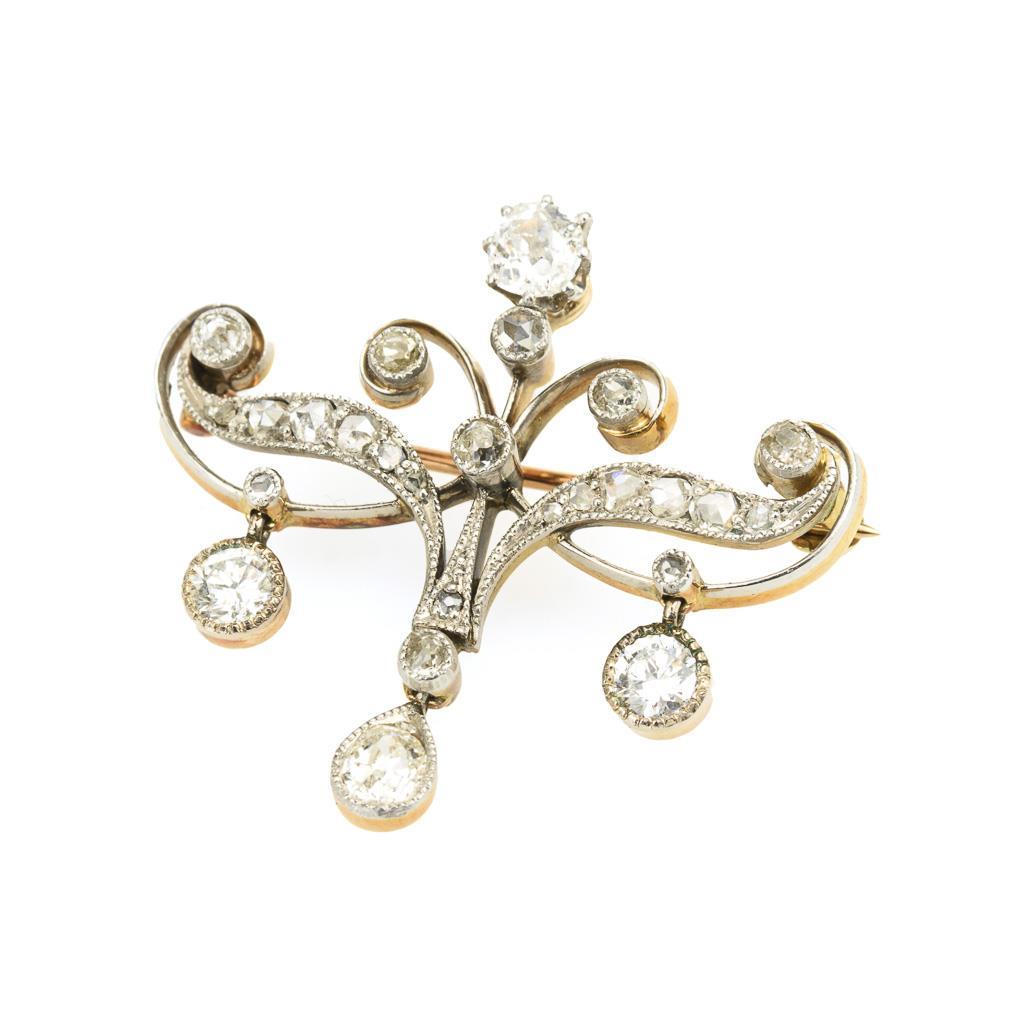 Jugendstil-Brosche mit Altschliff-Brillanten und Diamantrosen.