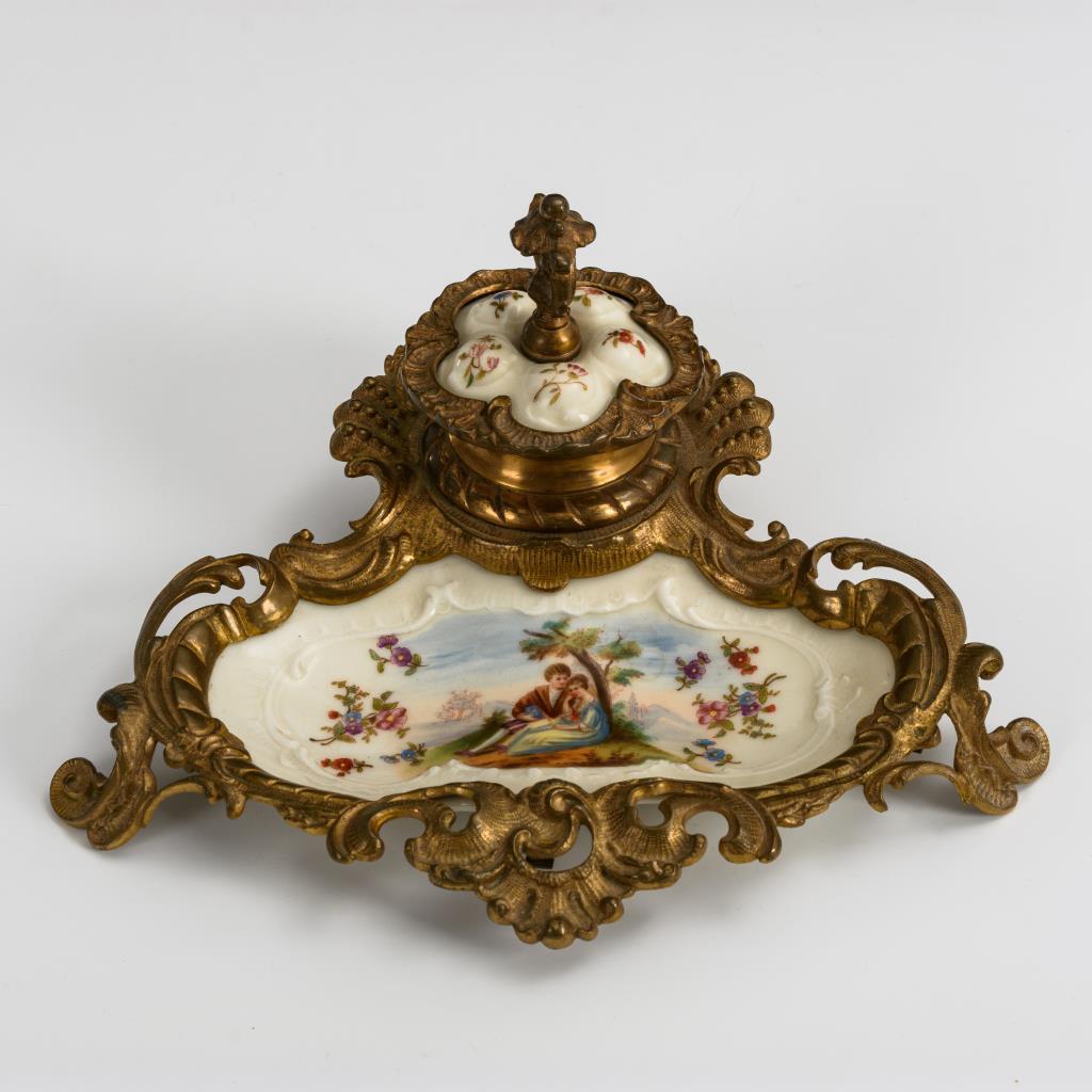 Teils durchbrochen gearbeitetes Rocaillegestell aus Bronze, Porzellaneinlage als Schreibschale sowie im scharnierten Tintenfassdeckel, Tintenfass mit Glaseinsatz.