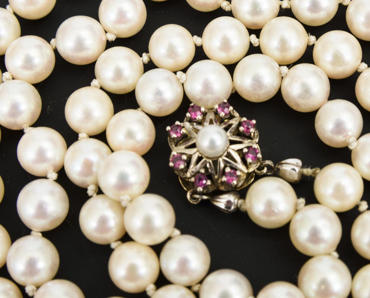 Schnürketten mit 128 Zuchtperlen in Einzelverknotung. Zierschließe mit 8 kleinen Rubinen und